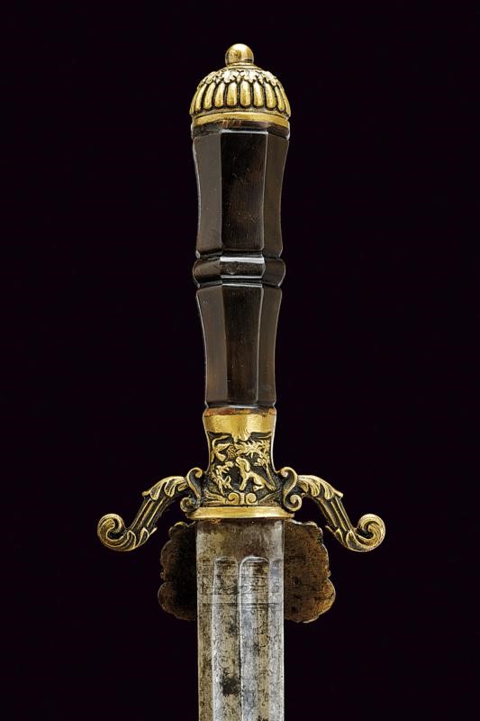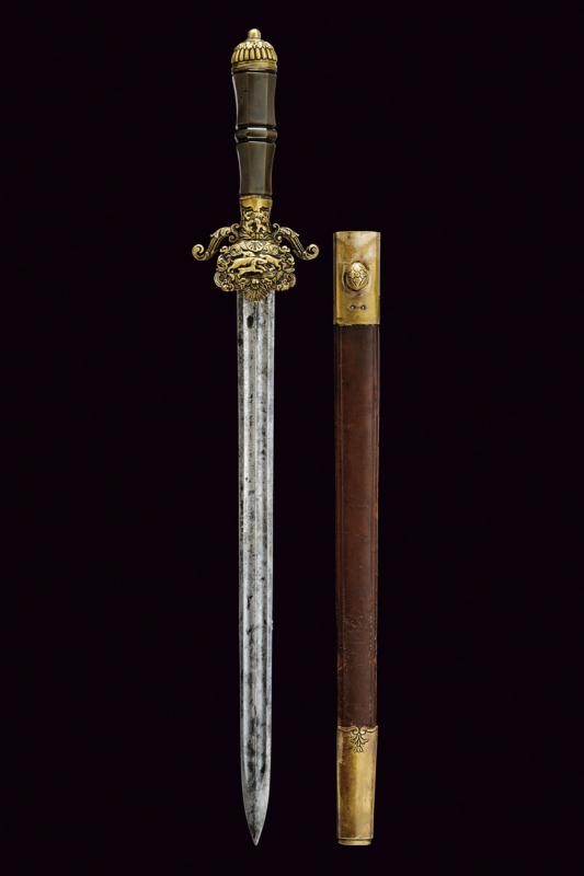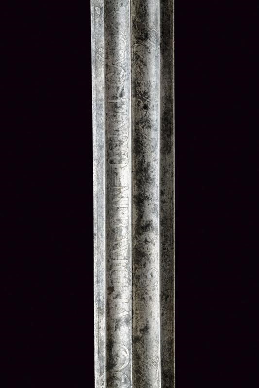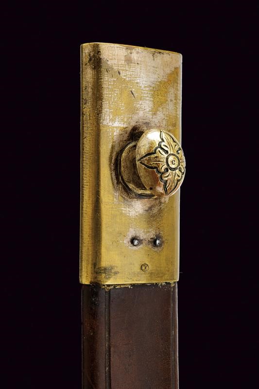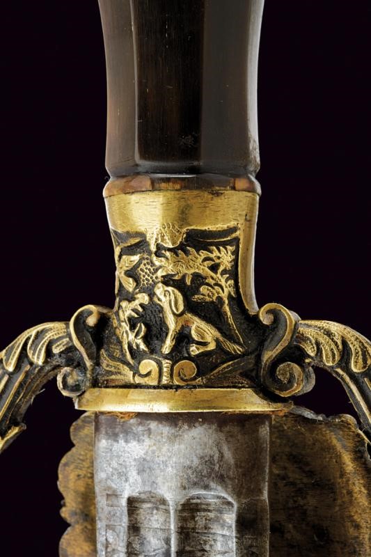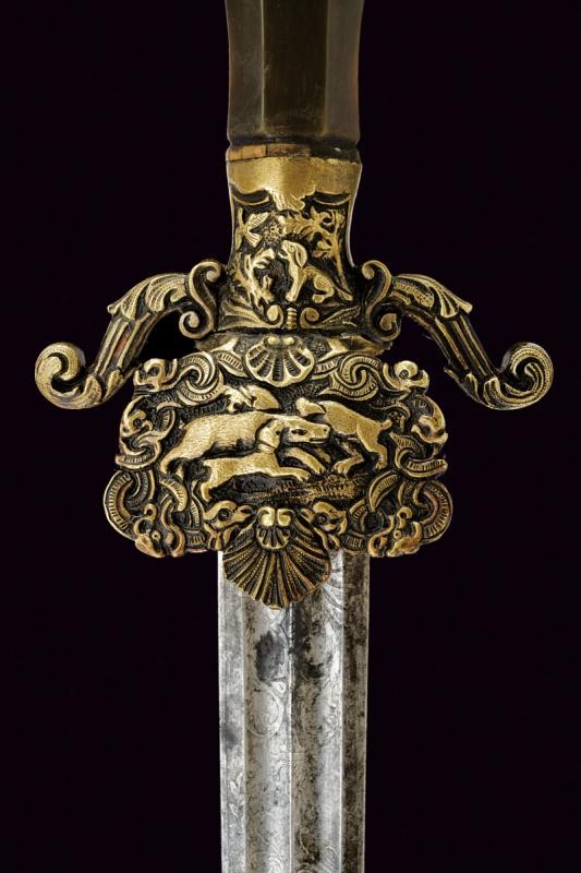 Lama dritta a due fili doppiamente sgusciata su entrambe le facce. Recante sul lato anteriore la dedica "Ricordo del compianto SOCIO Fondatore PININO MERAVIGLIA" posta fra decori a racemi, sul lato posteriore data e iscrizione "12 Febbraio 1889 ... Regg..." (non completamente leggibile), questa posta fra racemi e con un trofeo. Fornimento in ottone (un riparazione?). Pelta con scena cinegetica in rilievo fra rocaille, elso decorato en suite come anche i suoi bracci. Impugnatura in corno con nodo centrale, piccole mancanze. Cappellotto in ottone sempre ornato en suite. Fodero in cuoio con fornimenti in ottone.