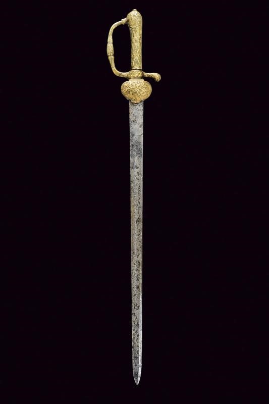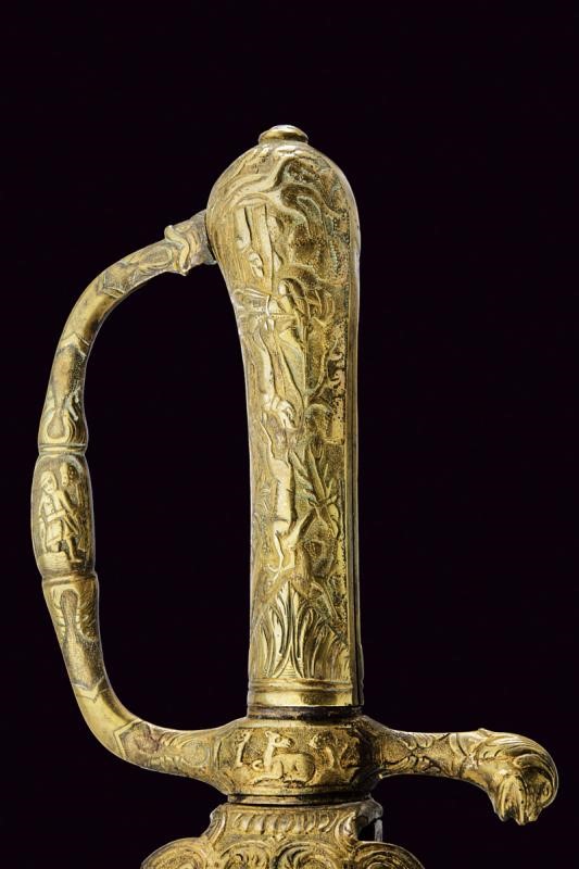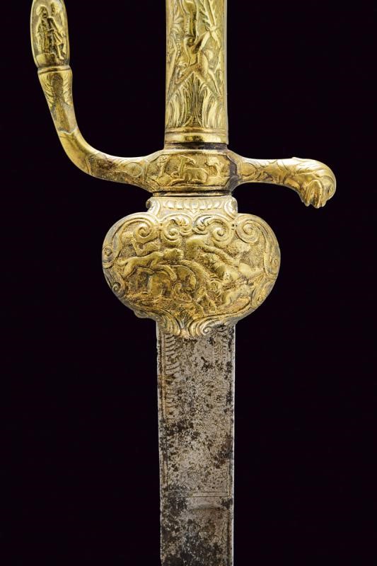 Lunga lama dritta a un filo e controfilo (ampie zone con danni da ruggine), la base con resti di incisioni. Bel fornimento in ottone massiccio, con scene di caccia in bassorilievo.