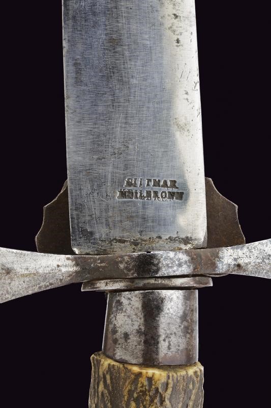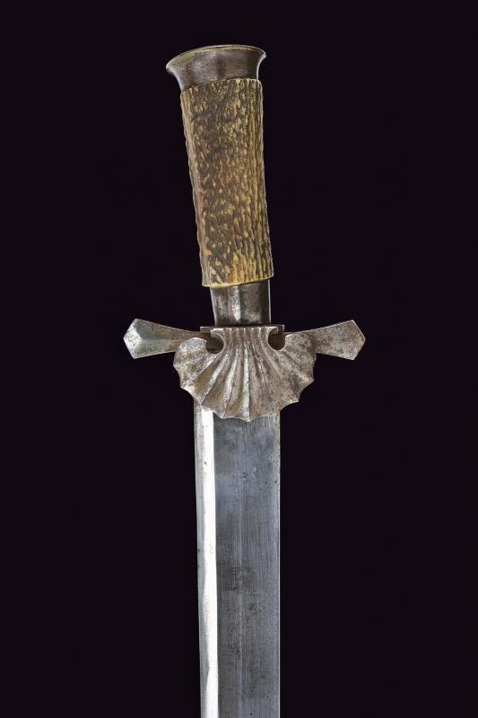Lama dritta a un filo e breve controfilo, piatta su un lato, sgusciata su quello opposto, recante alla base resti di una firma non chiaramente leggibile. Elso in ferro con valva a conchiglia sgusciata. Impugnatura in corno di cervo. Fodero in cuoio con fornimenti in ferro. Bottone a ghianda.