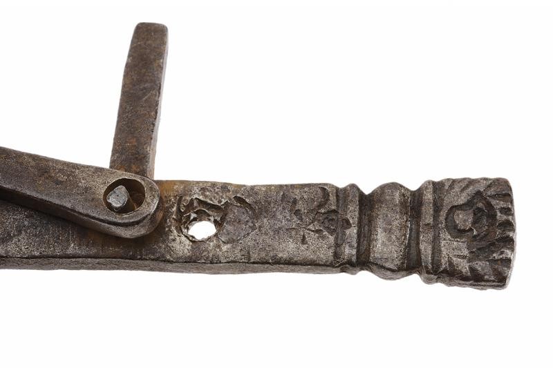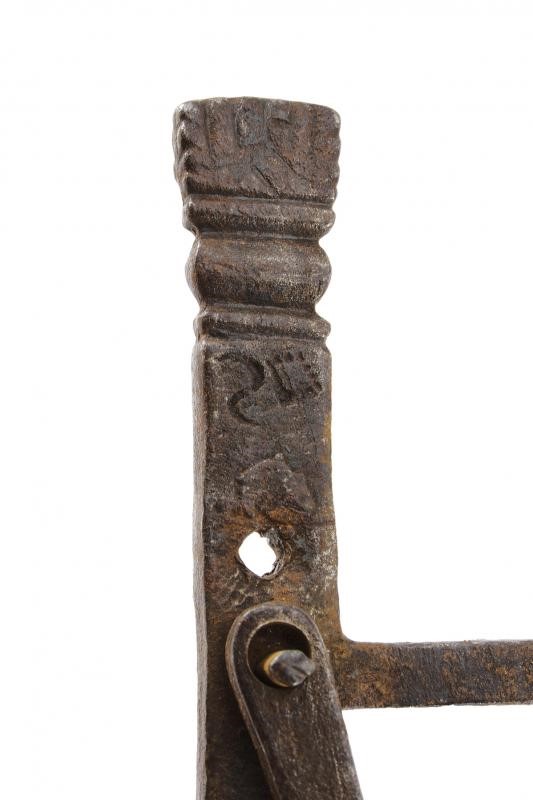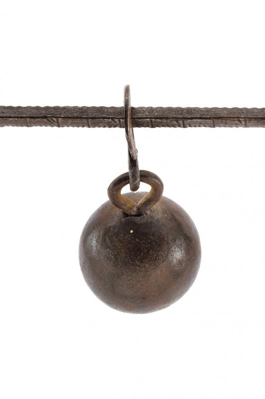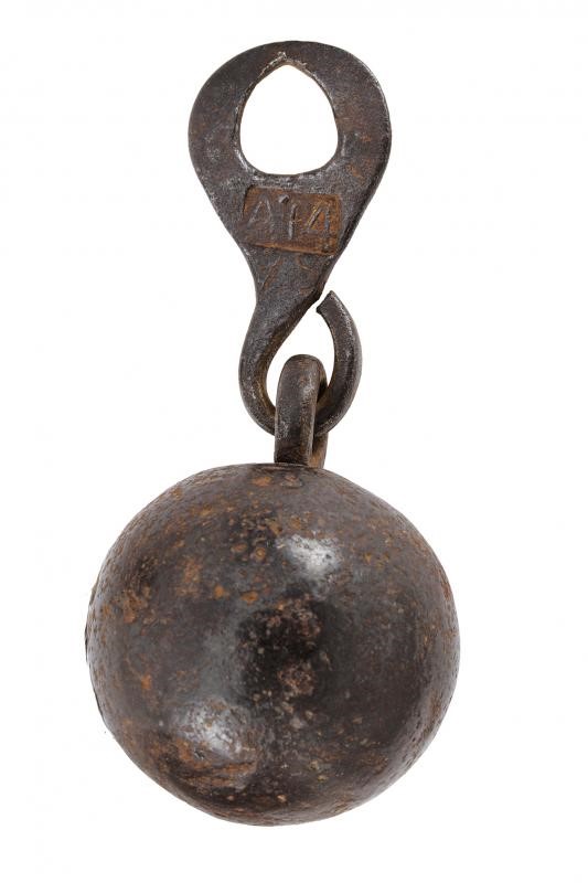 In ferro, testa con marcature completa di romano sferico, gancio ( manca un gancio); fusto con scala. Insieme a un altro romano di forma sferica con marcatura "A|4" e "47".