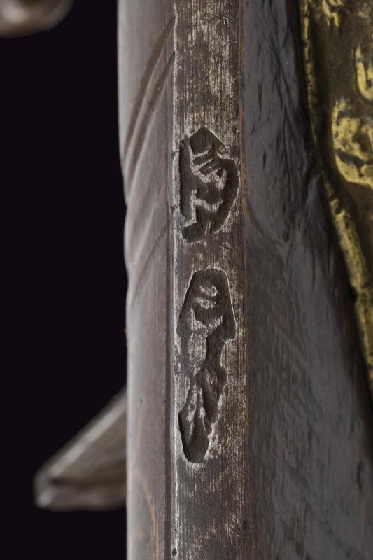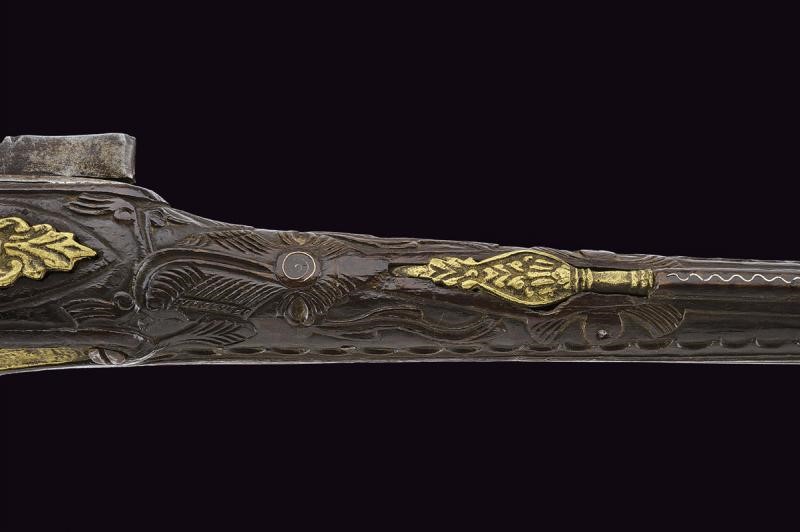 Lunga canna liscia, tonda, con culatta ottagonale, base decorata con agemine in rame a motivi geometrici; bindella e mirino. cal. 14.5 mm. Codetta con traguardo. Batteria a pietra focaia con cartella a bordi obliqui, totalmente incisa a racemi, la coda ingrossata. Meccanica funzionate. Cassa intera in legno scolpita a motivi geometrici e floreali ed arricchita da tarsie in rame. Fornimenti in ottone tutti incisi ed intagliati a animali, racemi e a motivi geometrici. Finta bacchetta.