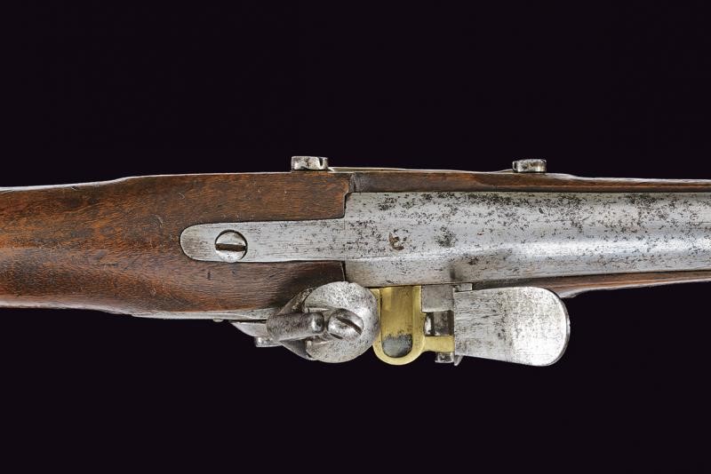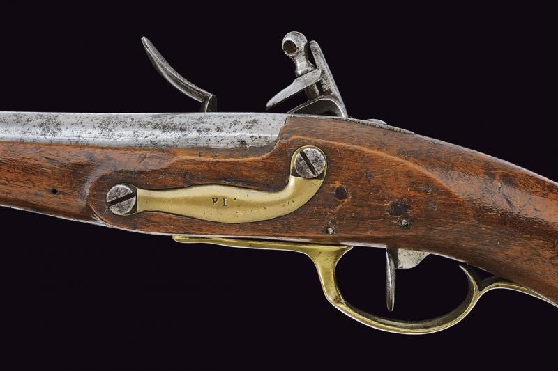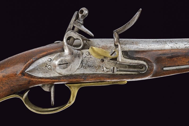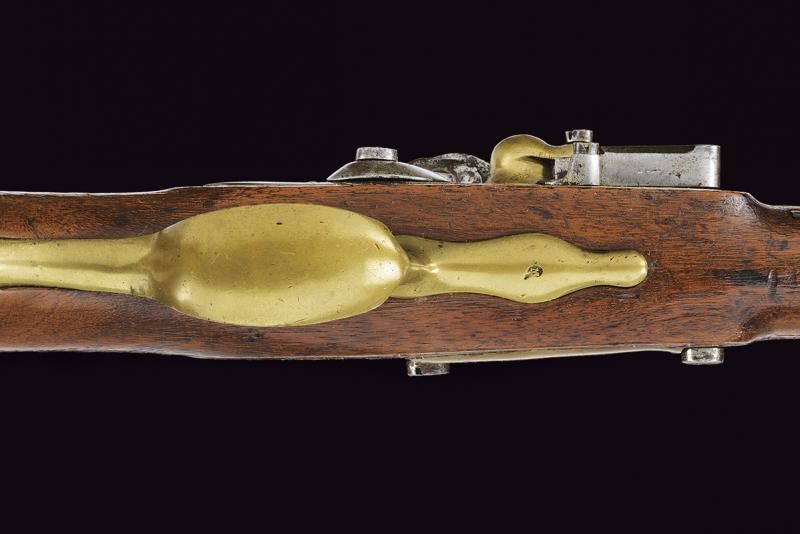Canna tonda liscia con culatta ottagonale, cal. 17,4 mm. Resti di un punzone al dorso. Batteria a pietra con marcatura "Brescia". Cassa intera in legno (crepe riparate all'impugnatura) con fornimenti in ottone. Rara tipologia.