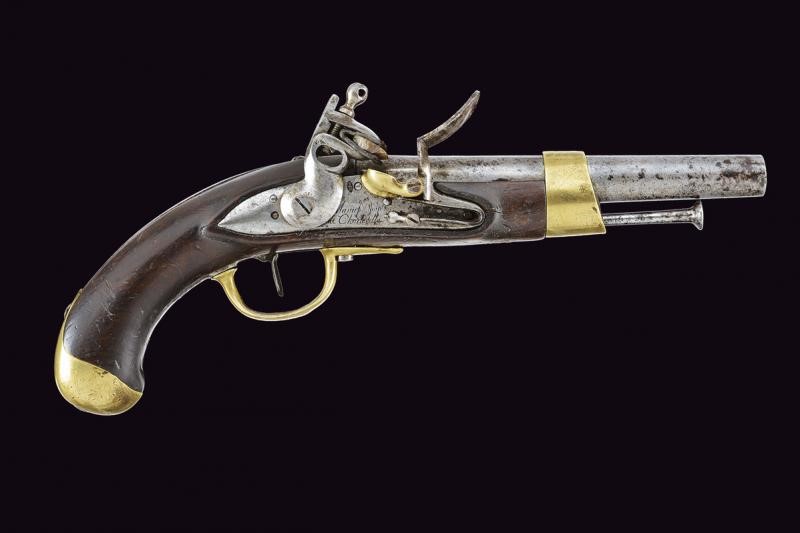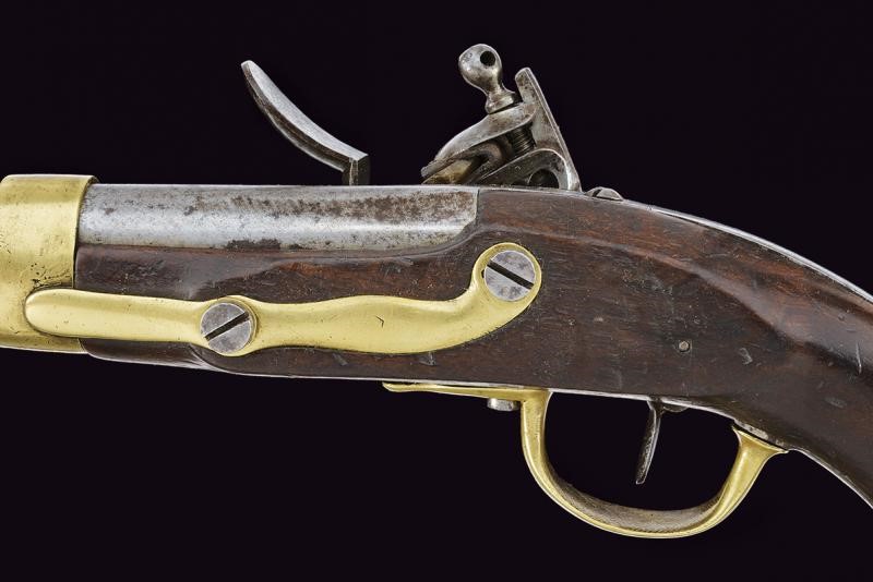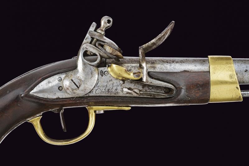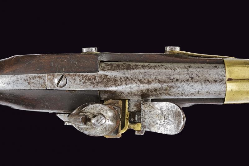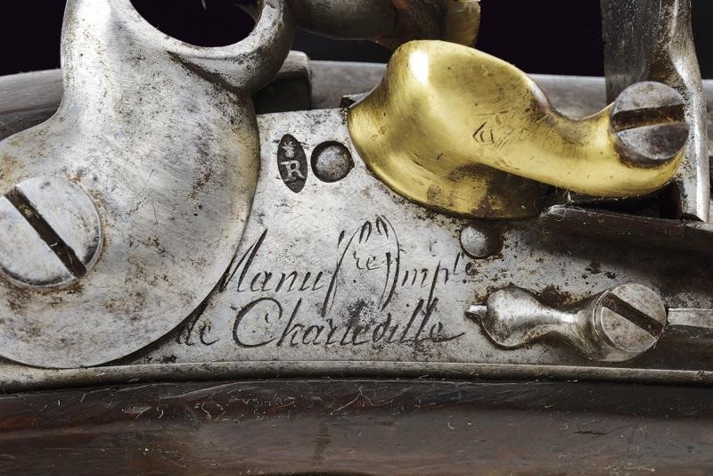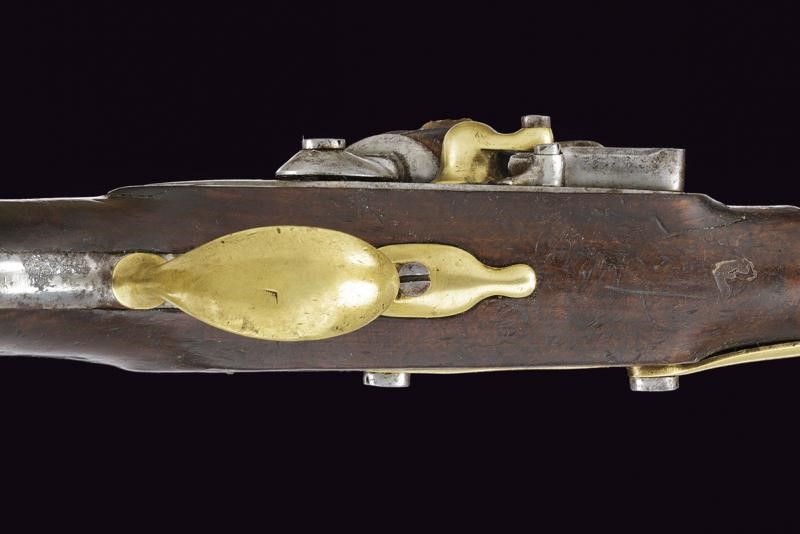 Canna tonda liscia con culatta quadra, cal. 17 mm. Batteria a pietra focaia con cartella piatta e marcata con la manifattura imperiale di Charleville e con punzone "R"; scodellino in ottone, coda tondeggiante. Mezza cassa in legno con fornimenti in ottone. Bacchetta in ferro.