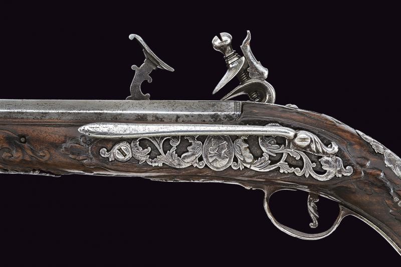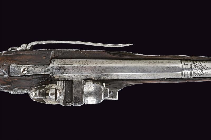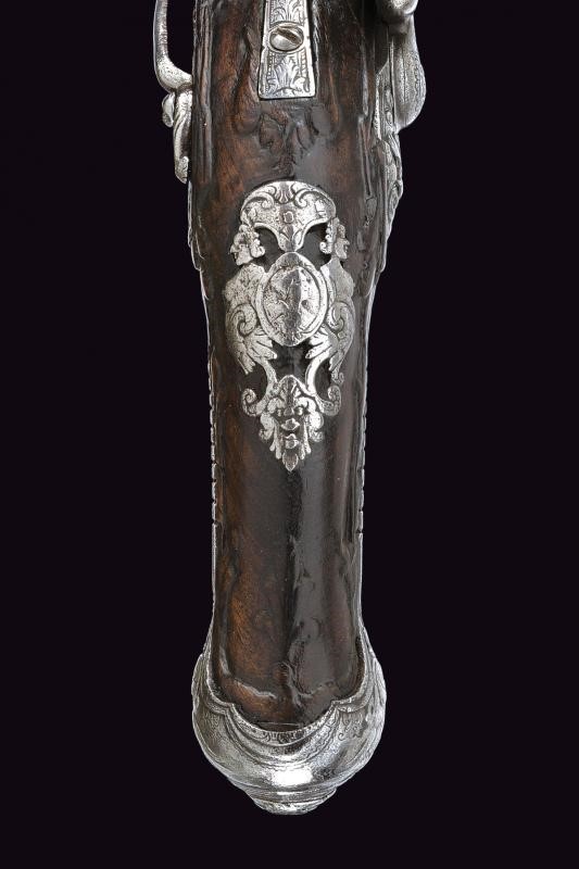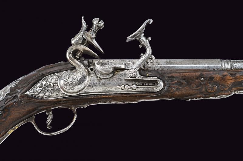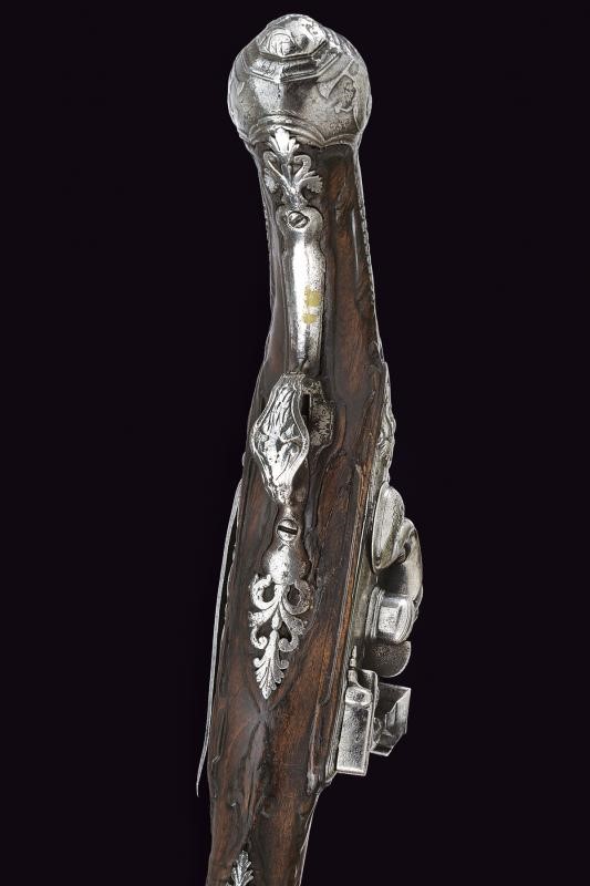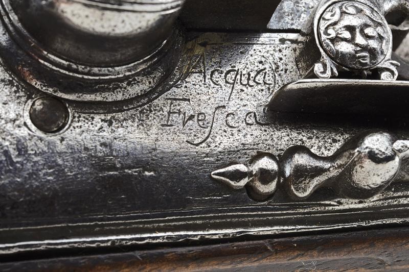Canna liscia a due ordini, la prima parte ottagonale avente una cornicetta alla base, dopo tre anellature ed un incisione a racemi tonda; cal. 10.4 in volata. Codetta incisa. Batteria alla fiorentina firmata "Acqua Fresca", la coda con mascherone intagliato, scodellino con copriscodellino scorrevole. Cassa intera in legno (difetti) in parte scolpito a motivi floreali. Fornimenti in ferro intagliato e in parte anche traforato (contropiastra con busto),la coccia con il busto di un uomo. Gancio da cintura in ferro, bacchetta in legno con battipalla in ferro.