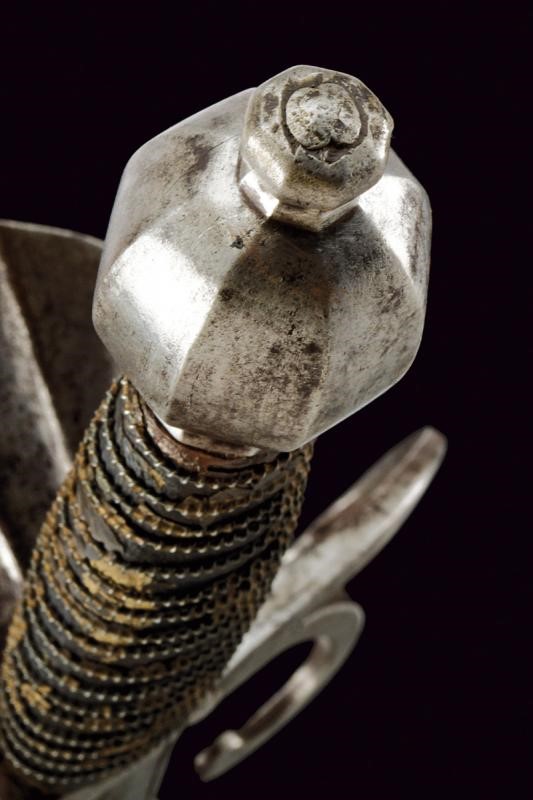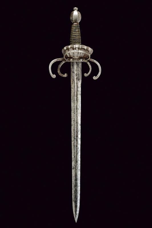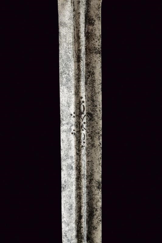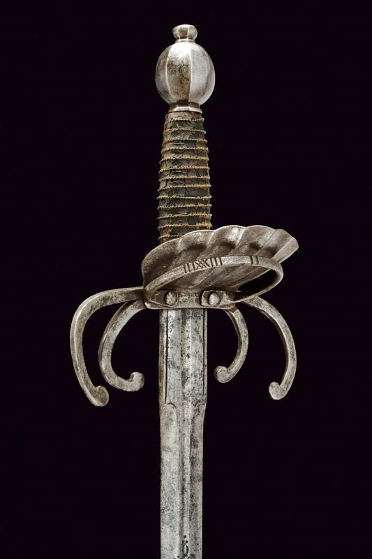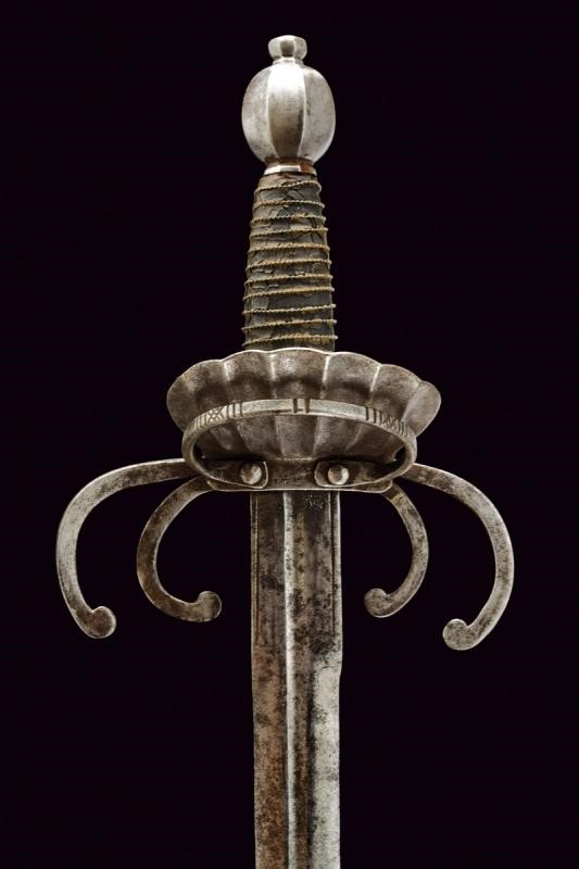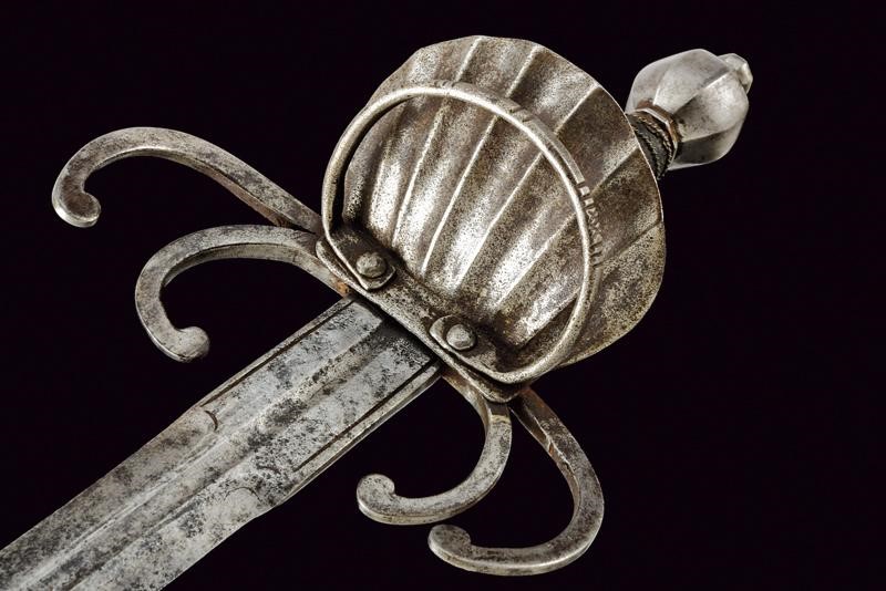 Lama dritta a due fili di sezione lenticolare, scanalata per oltre alla metà, il tallone scanalato al centro e delineato ai bordi. Tipico fornimento in ferro a doppio elso, anello di parata con intagli geometrici e valva a conchiglia. Pomo faccettato. Impugnatura in legno rivestita di cuoio e con trecciola metallica.