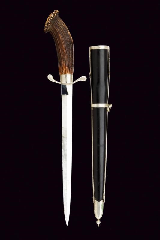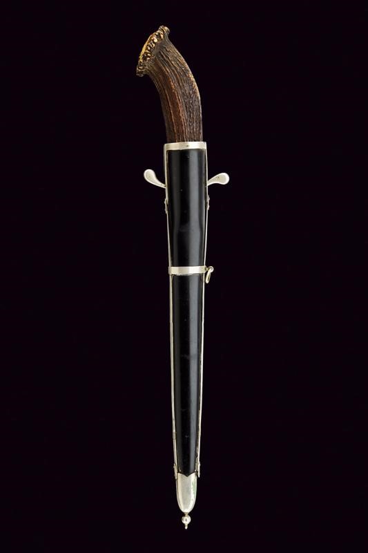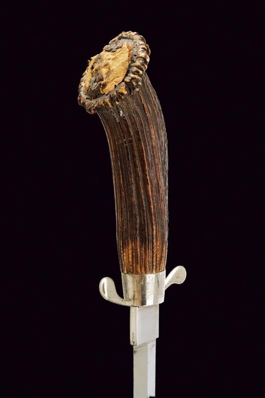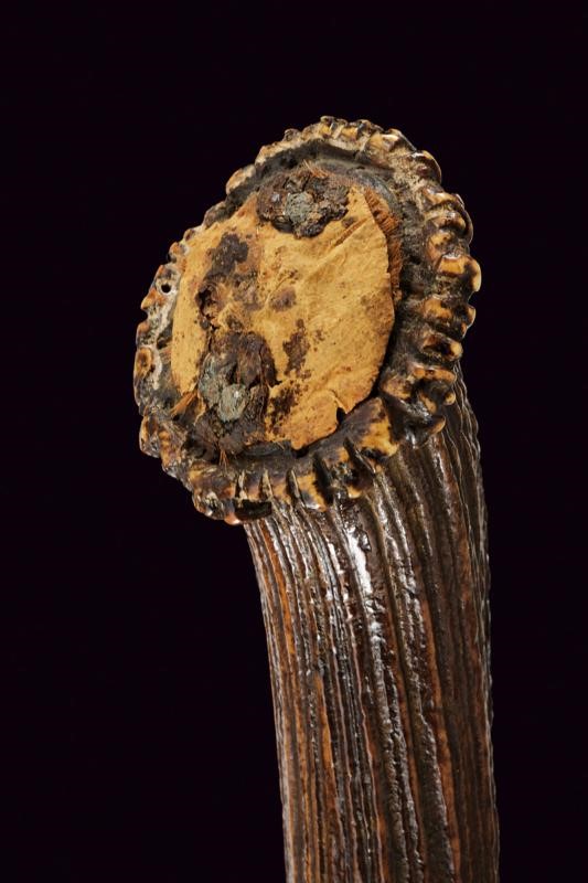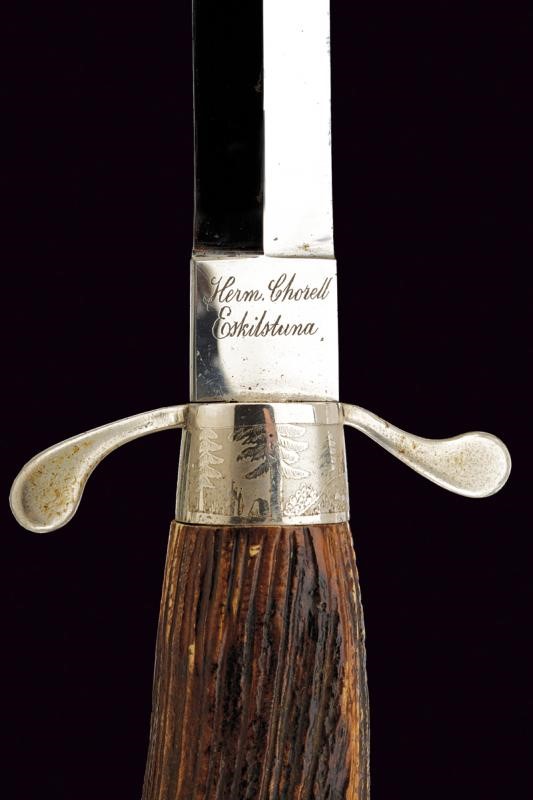Lama a specchio con minimi segni del tempo, recante al tallone la marcatura in corsivo "Herm Chorell Eskiltsuna". Fornimento in ferro con incisione al massello. Impugnatura in corno di cervo. Forse il cappellotto mancante. Bel fodero realizzato in lamina di corno bruno con fornimenti in metallo bianco. Due campanelle.
