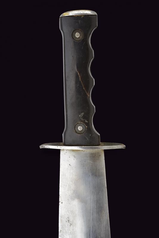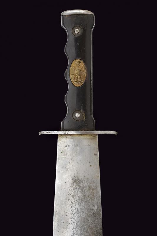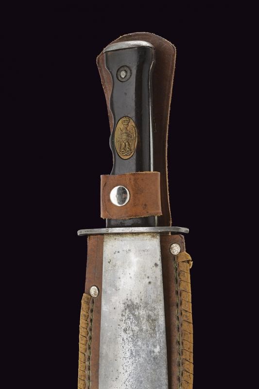 Lama dritta a foglia, a due fili, di sezione lenticolare, con resti di finitura nichelata. Crociera in ferro piatta e di forma ellittica. Impugnatura anatomica con guancette in corno bruno. Quella anteriore munita di medaglione recante in rilievo l'aquila sabauda coronata. Fodero in cuoio.