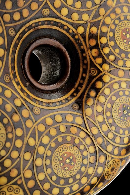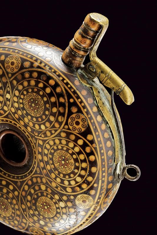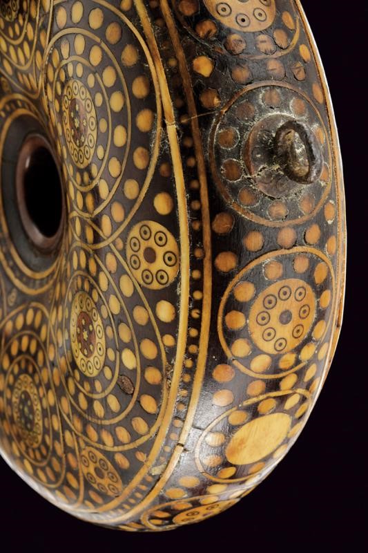 Corpo di forma circolare a ciambella con traforo al centro. Tutta la superficie riccamente intarsiata con cerchi, puntini, stelline e liste in osso. Il cannello in corno di cervo scolpito a balaustro, la chiusura in ottone, la molla e i due anelli di sospensione in ferro.