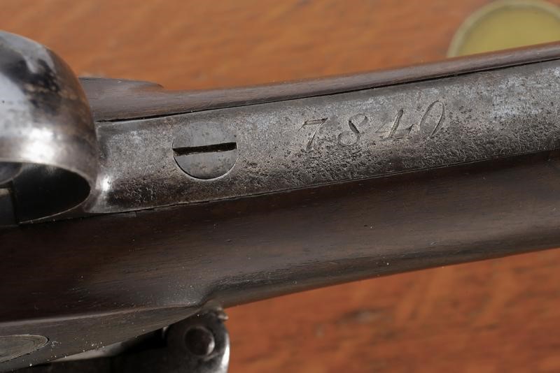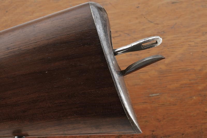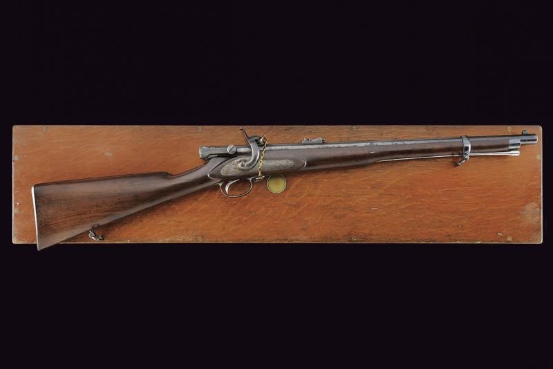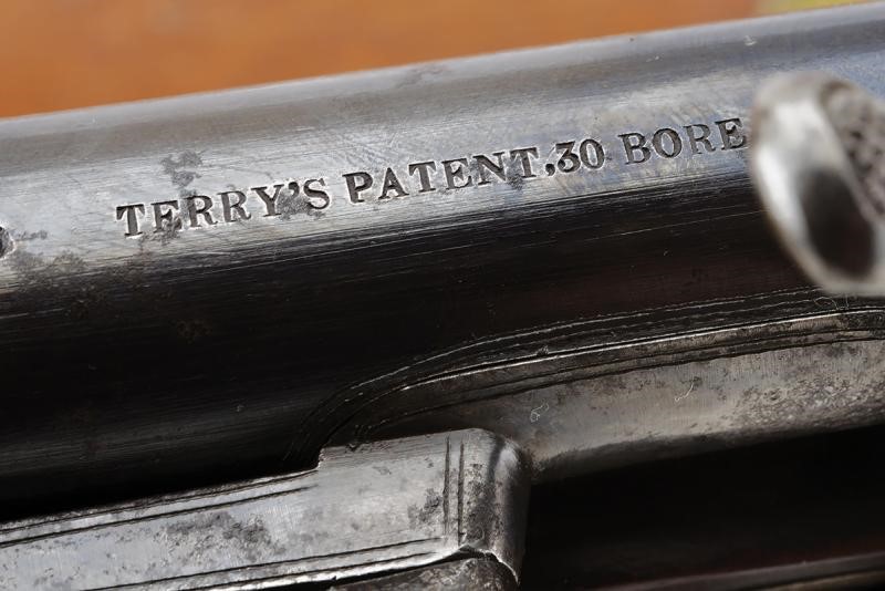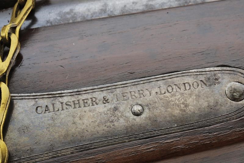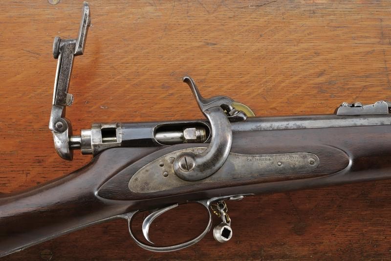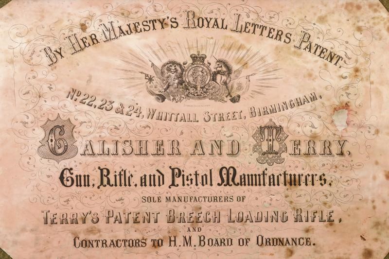 Canna tonda, rigata e brunita (anima pulita, rigatura ben visibile), la base con brevetto "TERRY" e dicitura "30 BORE", alla metà marcatura "CALISHER & TERRY MAKERS TO H.M. WAR DEPARTMENT"; munita di alzo abbattibile e mirino, cal. 13 mm. Batteria a luminello a molla in avanti con cartella marcata "CALISHER & TERRY LONDON", luminello con sicura dotata di catenella in ottone; otturatore girevole-scorrevole con punzone. Cassa intera in legno con fornimenti in ferro; al calciolo sportellino contente un prolungamento della bacchetta, questa in ferro. In cassetta di legno originale completa di tutti gli attrezzi, fra cui fondipalle, svitaluminello, cacciaviti, scovolini e anche la sagoma metallica per dare forma alle cartucce di carta; all'interno etichetta con dicitura "BY HER MAJESTY'S ROYAL LETTERS PATENT... / CALISHER AND TERRY .... / TERRY'S PATENT BREACH LOADING RIFLE"