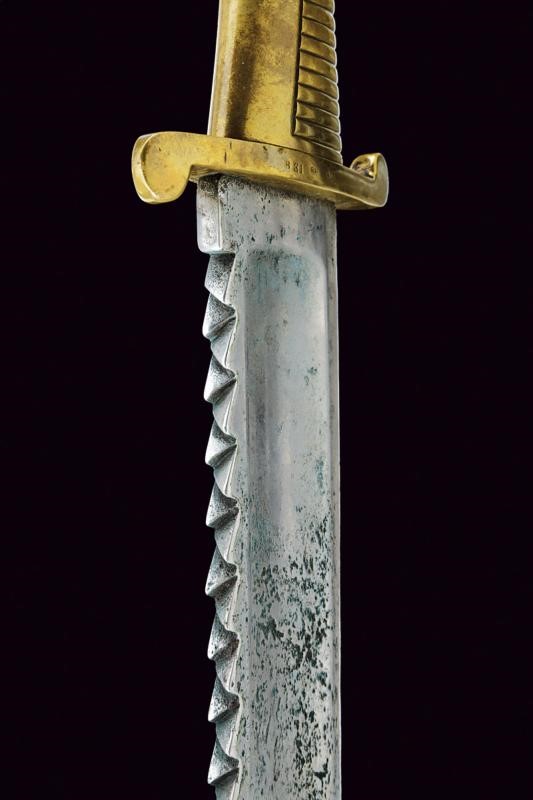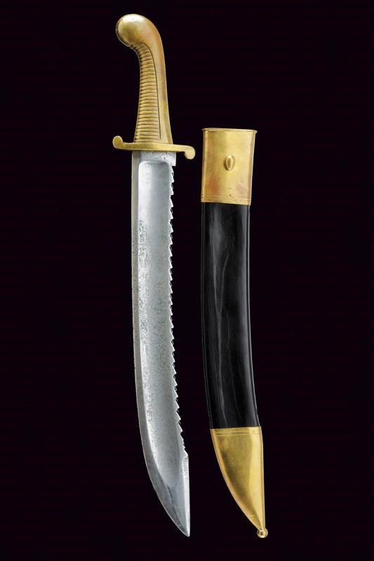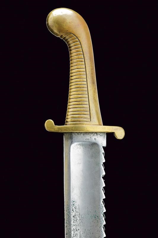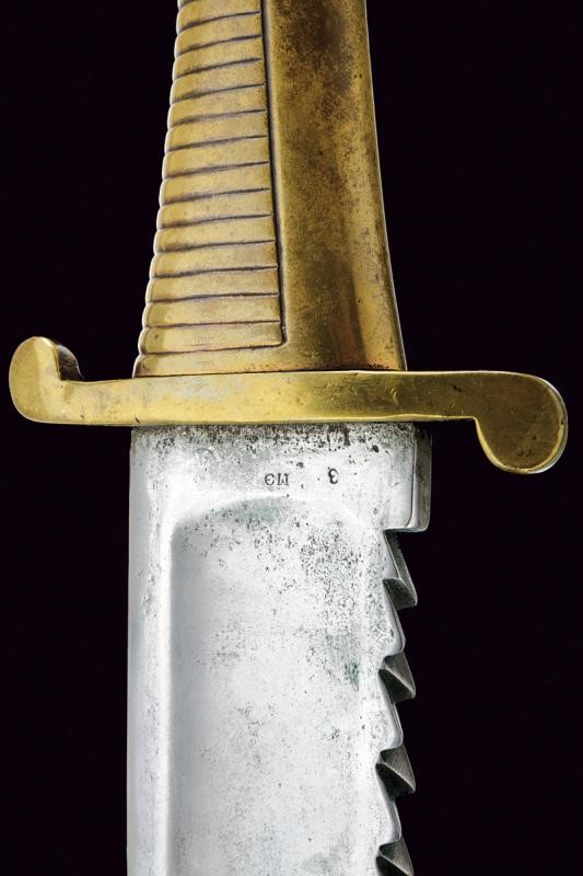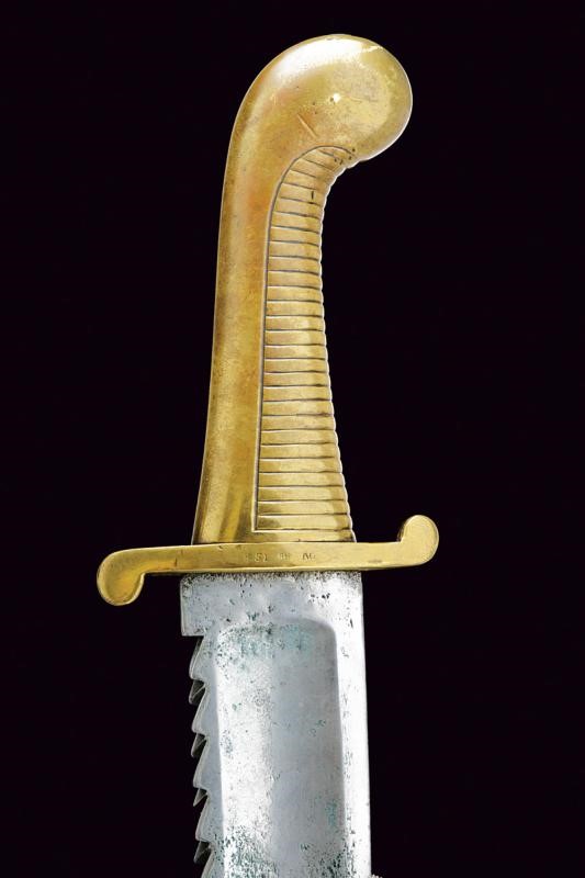 Pesante e larga lama leggermente curva con ampio sguscio (forti intaccature al centro), il tallone con punzoni "MЭ" e "з". Massiccio fornimento in ottone, elso punzonato "831", "BH" e "AG"; pomo angolato ed impugnatura con scanalature orizzontali. Completa di fodero in cuoio (più tardo?) con fornimenti in ottone.