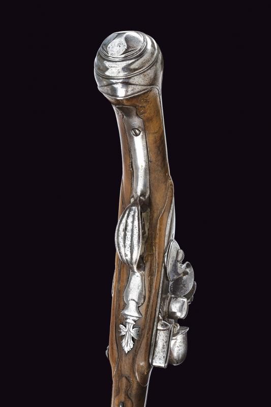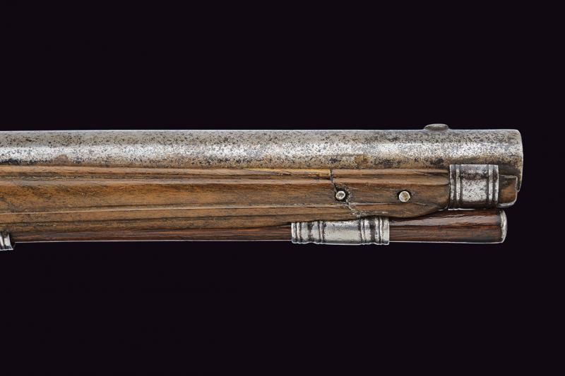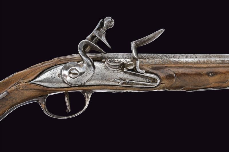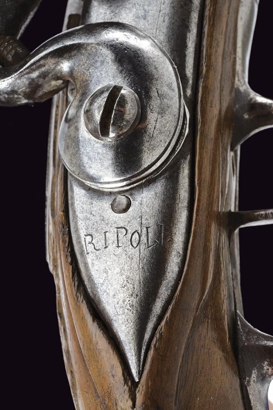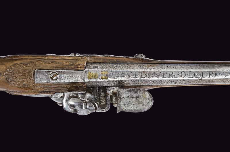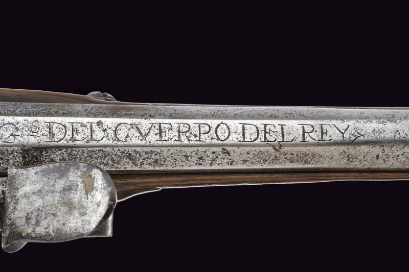 Canna liscia a due ordini, prima ottagonale poi tonda, recante alla culatta resti di marche rimesse in ottone, di cui una coronata e recante le lettere "R. DB / MAS", seguite dalla marcatura "G.s DEL CUERPO DEL REY", con mirino in volata, cal. 16,4 mm. Intaccature. Batteria a cartella lievemente tondeggiante con marcatura di Ripoll alla codetta. Meccanica ben funzionante. Cassa intera in legno (alcune piccole crepe). Fornimenti in ferro. Scudetto dorsale coronato. Contropiastra parzialmente traforata a volute e fiorami. Intaccature, segni del tempo. Bacchetta in legno con battipalla in ferro e cavatracci.