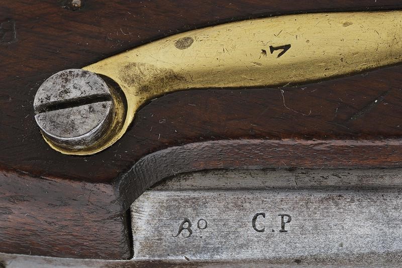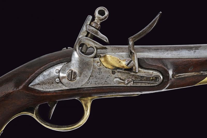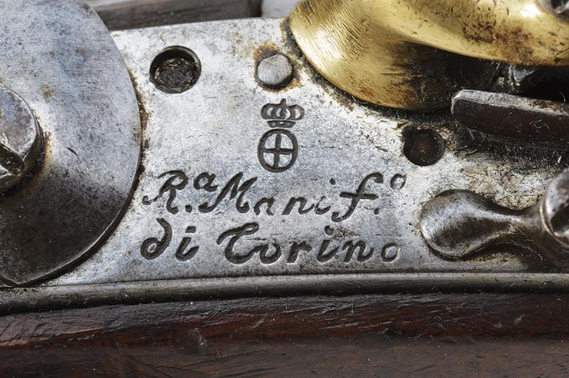 Canna liscia tonda con culatta ottagonale, punzonata "BO" e "CP", "CQ", "FP", cal. 15,5 mm. in volata. Batteria a cartella piatta marcata "R.a Manif.a di Torino". Scodellino in ottone. Meccanica ben funzionante. Cassa intera in legno timbrata "ARMANDA", "BI" e con un altro marchio non chiaramente leggibile. Fornimenti in ottone. Coccia e contropiastra con resti di punzoni, forse "N", ponticello punzonato "ZG", il bocchino "FR". La coccia anche con tracce di numerazione. Bacchetta in ferro.
