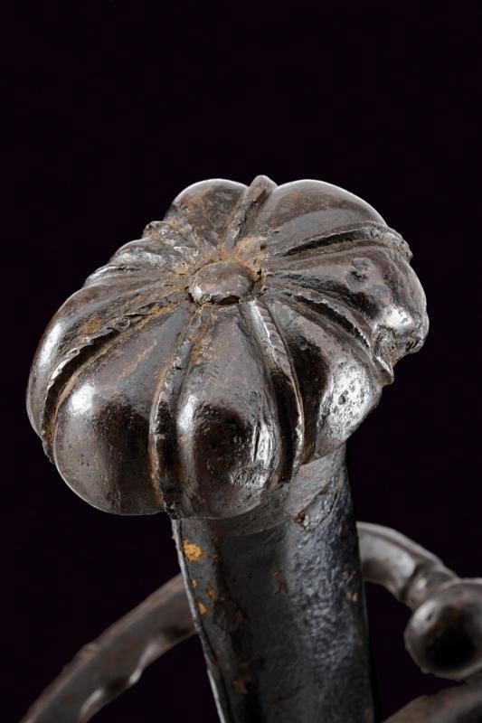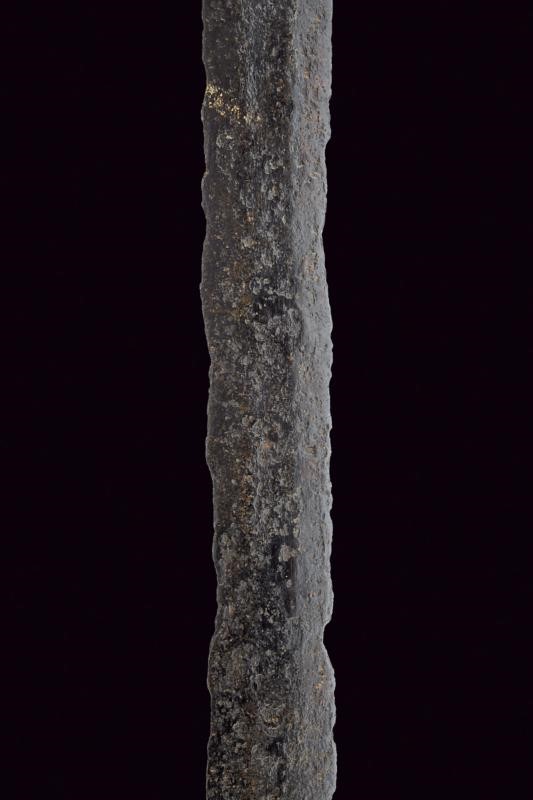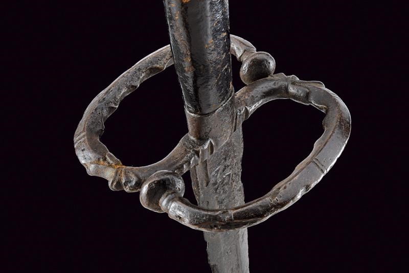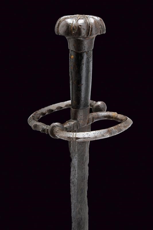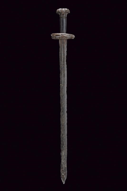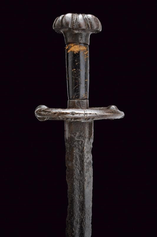 Lama dritta a due fili di sezione esagonale, recante sguscio centrale al forte, il tallone con scanalature laterali. Fornimento in ferro con bracci dell'elso controcurvati a "S", dotati di base a testa di mostro e lato interno decorato a onde in rilievo; le teste a bottone. Pomo ben proporzionato, a forma di fungo formato da otto lobi divisi da segmenti cordati. Impugnatura lignea con rivestimento in cuoio di epoca successiva. La superficie con diverse intaccature dovute all'epoca, che conferiscono a questa rara arma ancor più fascino e bellezza.
