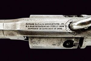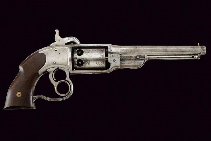 Canna ottagonale rigata (rigatura visibile, segni di pitting all'interno), dotata di mirino in ottone a cuspide, cal. 36. Punzone "H". Tamburo liscio a sei colpi. Meccanica funzionante. Castello marcato nella parte superiore con dicitura della fabbrica e con brevetti del 1856, 1859 e 1860. Impugnatura con guancette lisce in noce recanti tracce di marcature sul fondo e resti di timbro d'ispezione militare. Timbro "C" sulla base del calcatoio e sul castello. Qualche lieve traccia di finitura in alcuni punti, alcune intaccature. Grande ponticello a guardia munito di grilletto e leva di caricamento ad anello.