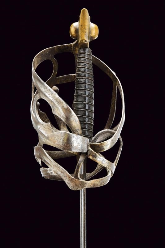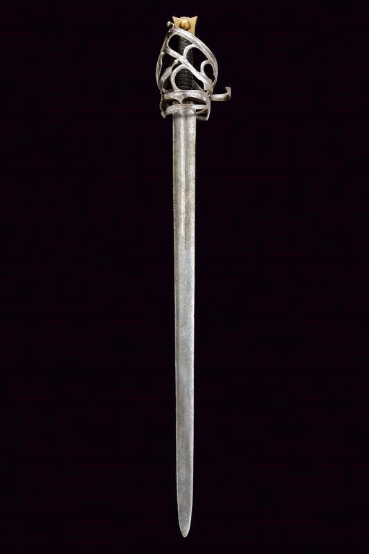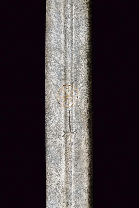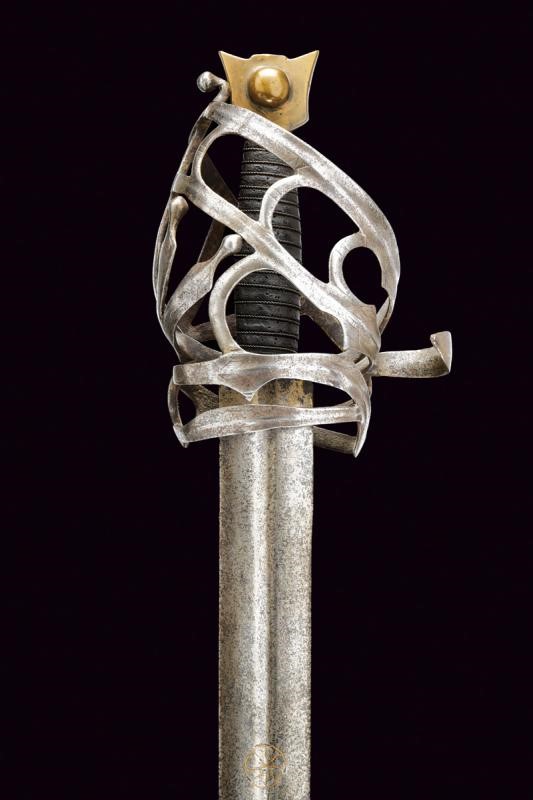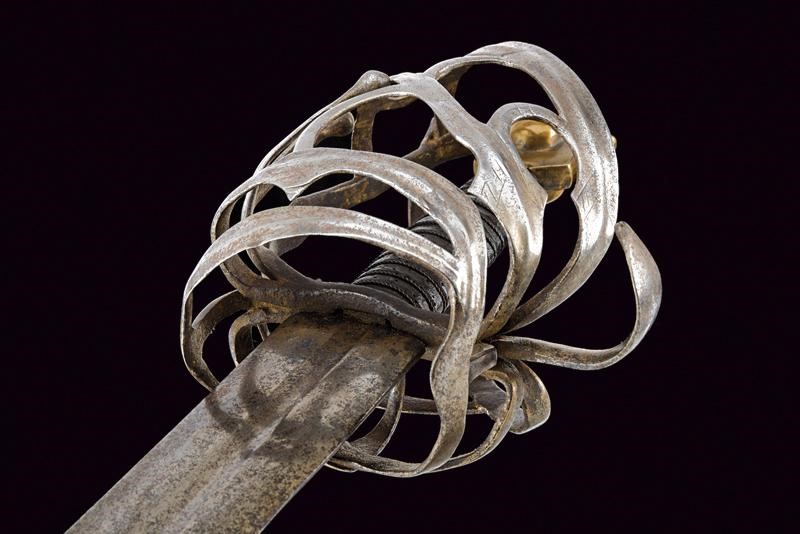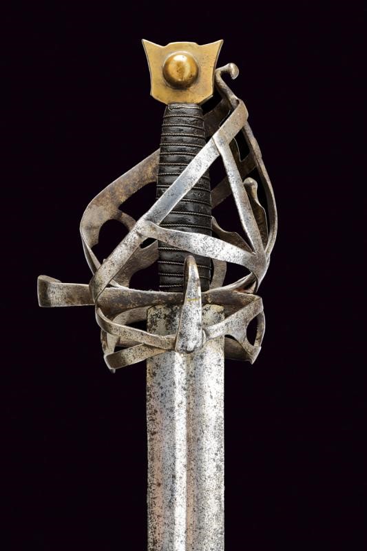 Larga lama dritta a due fili con sguscio centrale alla base, sul un lato croce su ruota con resti di agemine in bronzo. Tipico fornimento in ferro con resti di incisioni. Braccio dell'elso incurvato, anello da pollice. Pomo in ottone a testa di gatto. Impugnatura in legno rivestita di cuoio e con trecciola metallica.