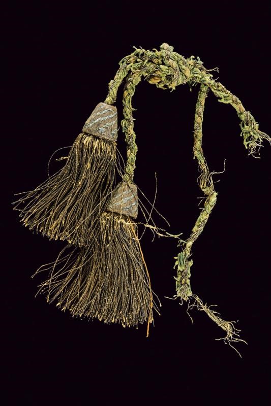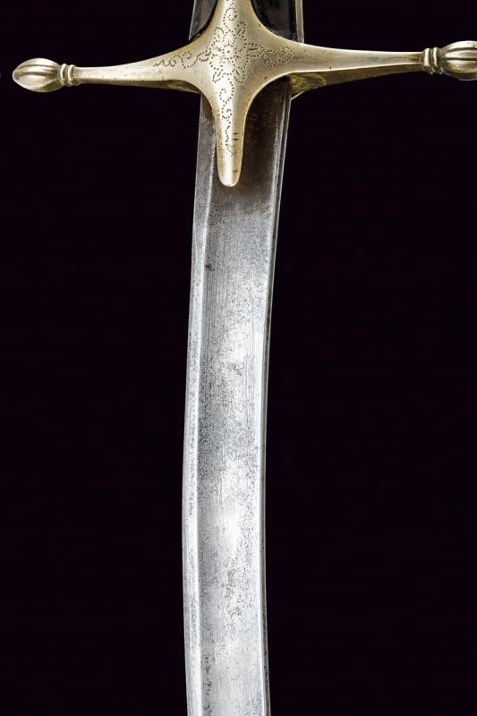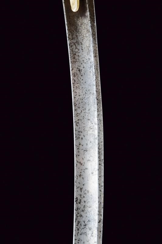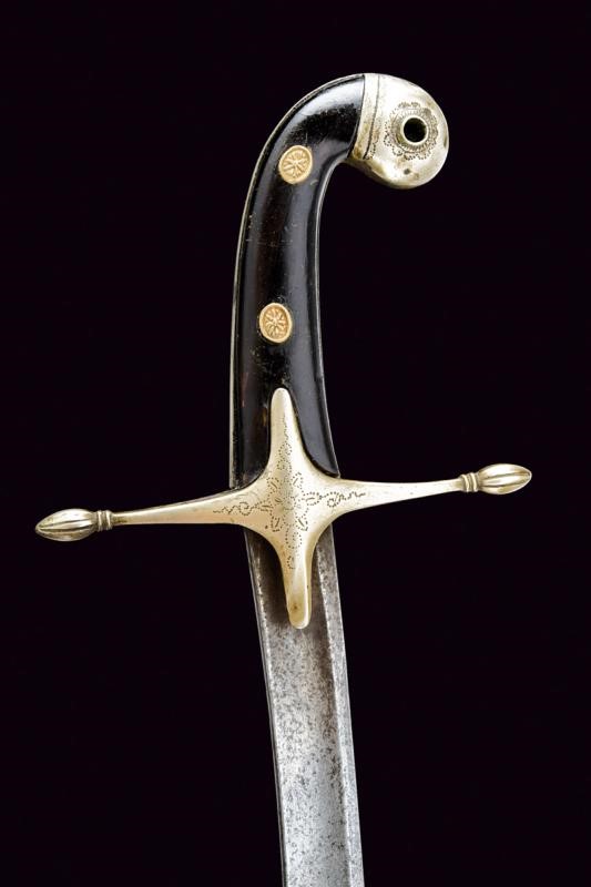 Lama curva a un filo e breve controfilo, sgusciata per buona parte della lunghezza. Qualche intaccatura soprattutto in punta. Elso in metallo bianco con alette fermafodero, bracci dritti terminanti a cuspidi, la superficie con incisione floreale a trattini. Impugnatura con guancette in corno bruno con borchiette in metallo dorato. Il pomo con cappellotto in metallo bianco munito di sforatura. Antica dragona (distaccata) in tessuto e canutiglia dorata. Fodero in metallo bianco (bozzi) con vela in ferro. Fornimenti in ottone. Due fascette con campanella, ornate con decoro floreale che riprende il fregio dell'elso.