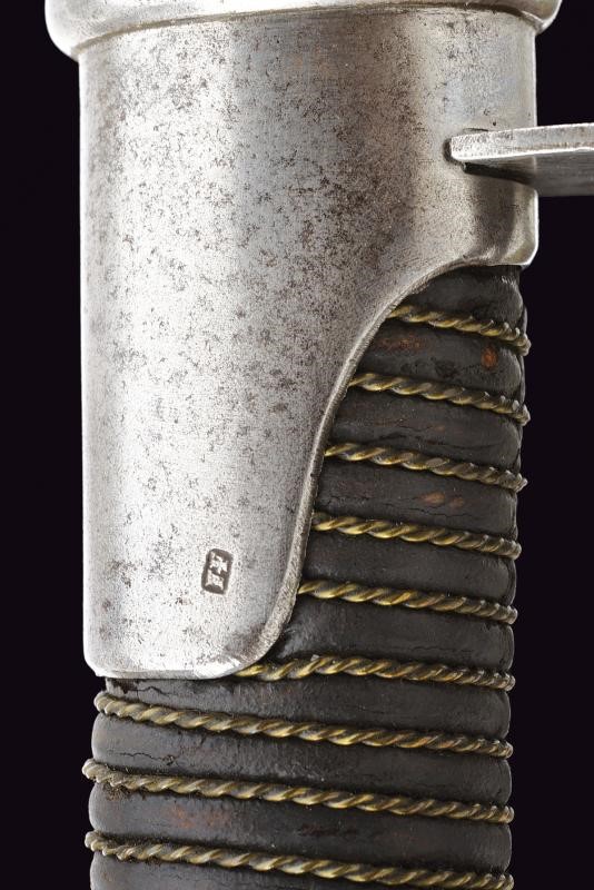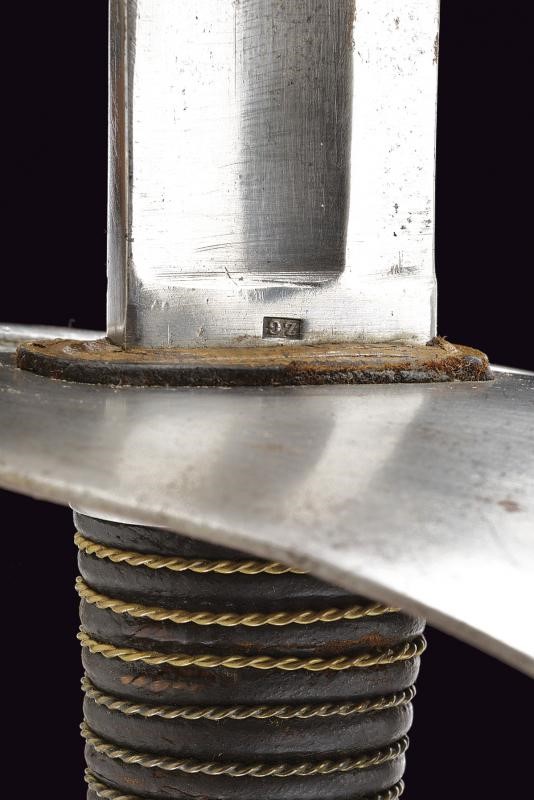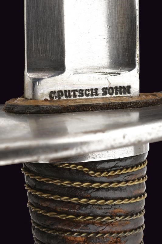 Lama curva a un filo, punta e breve controfilo, costolata al debole, sgusciata, con punzone "ZG" al tallone e marcatura "C. PUTSCH SOHN". Ampio fornimento in ferro con spacco a goccia, punzonato "ZL". Impugnatura con rivestimento di cuoio e trecciola in ottone con lieve usura; cappetta corta liscia. Fodero in ferro a due campanelle. Qualche intaccatura e ruggine superficiale facilmente pulibile.