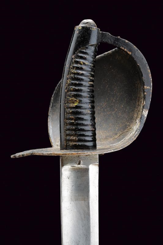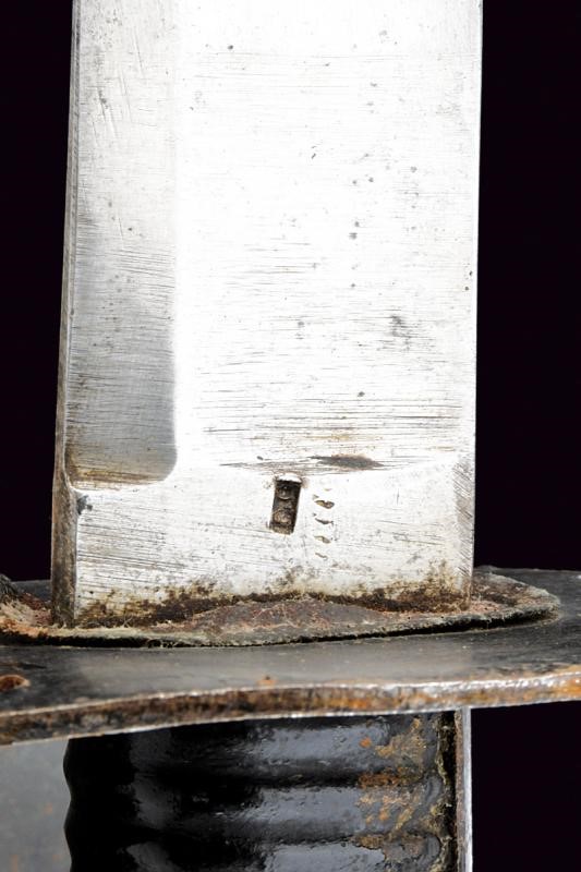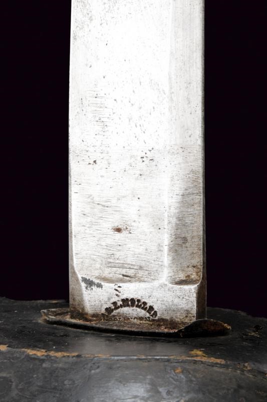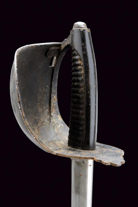 Larga lama leggermente curva a un filo e controfilo, ampiamente sgusciata, con marcatura "A & E. HOLLER SOLINGEN" e con punzone poco leggibile. Fornimento in ferro bitumato, munito di ampia guardia liscia; impugnatura in ferro, anche questa dipinta di nero, con cappetta lunga liscia. Completa di fodero in cuoio con fornimenti in ottone (punzone "FC" e "BD").