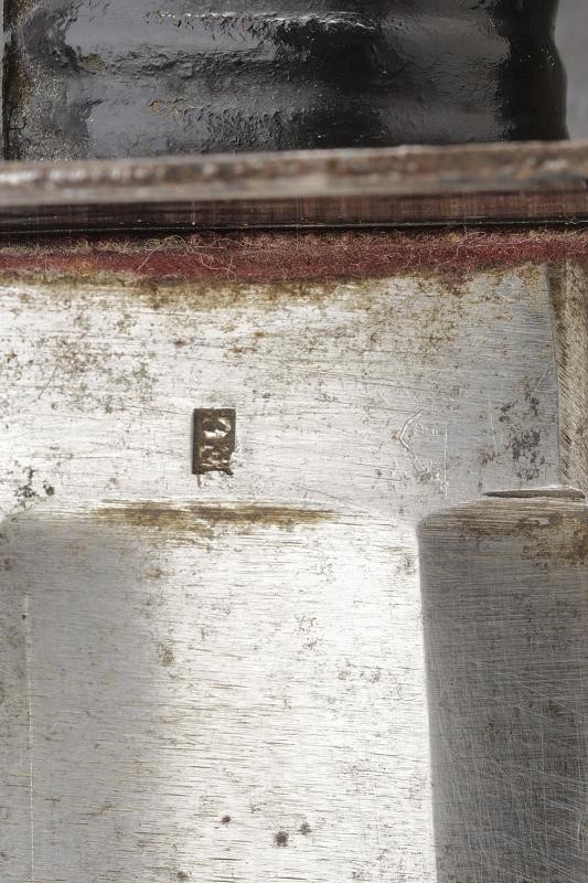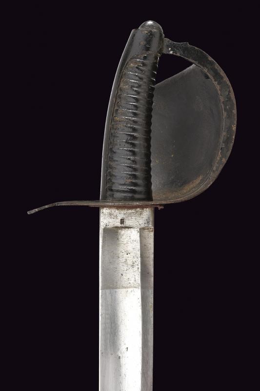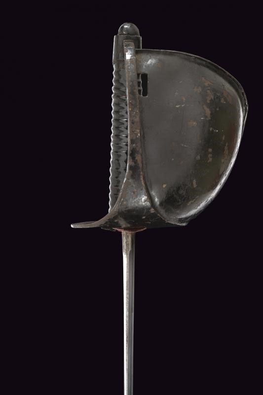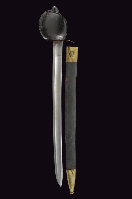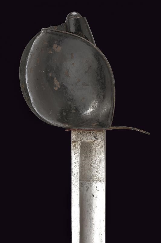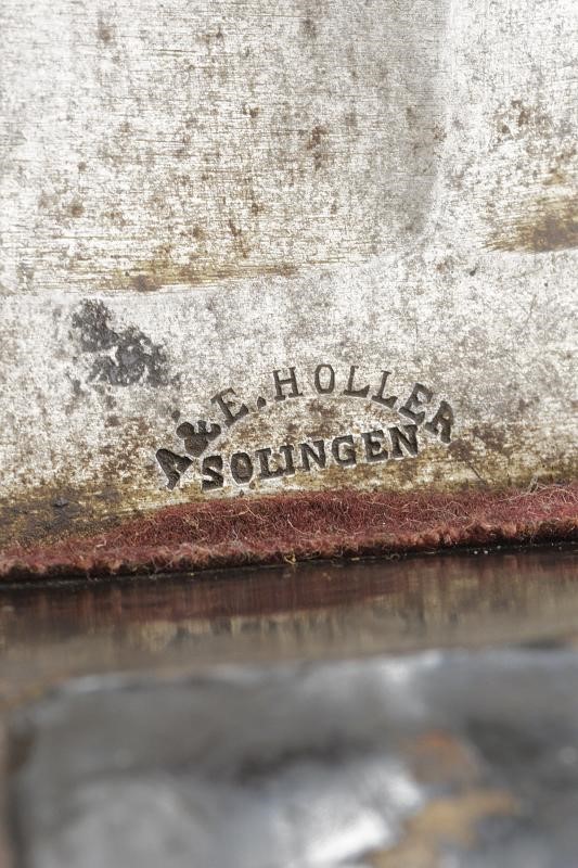 Larga lama quasi dritta a un filo e punta con ampio sguscio centrale, il tallone marcato "A&E. HOLLER / SOLINGEN" e con punzone "FC". Tipico fornimento in ferro bitumato come anche l'impugnatura. Fodero in cuoio con fornimenti in ottone recanti punzoni "FC".