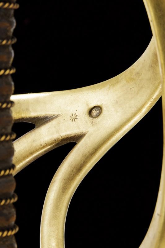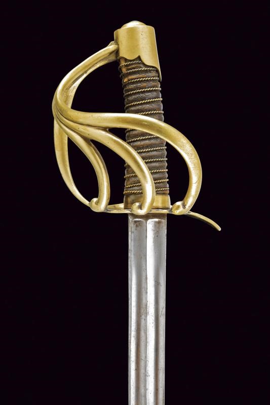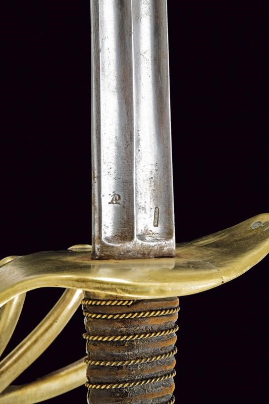 Lama dritta a un filo, punta e breve controfilo, doppiamente sgusciata, recante al forte il punzone a fascio littorio e marchio a monogramma "AP". Fornimento in ottone a quattro rami di guardia con riparazione alla coccia sul lato di parata. Recante il punzone "F" entro un ellisse ripetuto, anche all'interno dei rami e sulla cappetta. Sul ramo principale di guardia la marcatura "VERSAILLES" e il timbro "B". Al dorso della cappetta punzoni non chiaramente leggibili. Impugnatura in cuoio con trecciola in filo di ottone. Fodero in ferro (bozzi) a due campanelle con resti di un punzone coronato.
