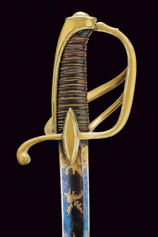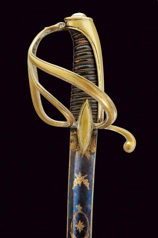 Lama curva a un filo e breve controfilo, sgusciata, brunita al forte e con piccole incisioni a racemi e trofei dorate (la finitura solo in parte ancora presente, rinfrescata?). Fornimento in ottone a tre rami di guardia. Alette fermafodero cuspidate. Cappetta lunga liscia. Impugnatura con rivestimento in pelle parzialmente usurato e con avvolgimento di trecciola e filo d'ottone. Fodero in ferro con segni d'uso e del tempo, bozzi, e piccola vela in ferro. Imboccatura e fascette in ottone, come anche le due campanelle.