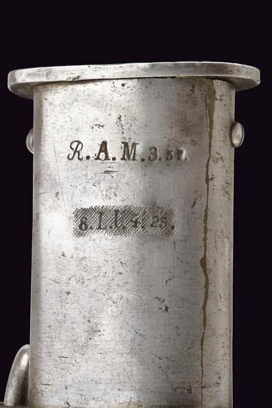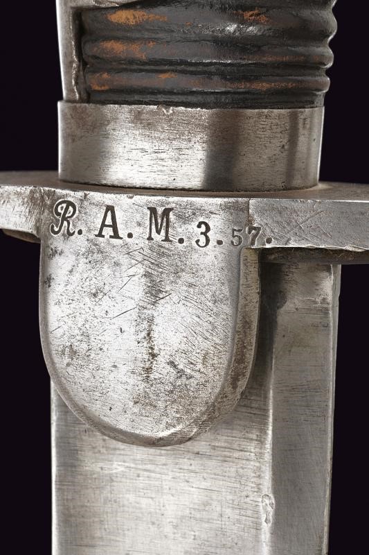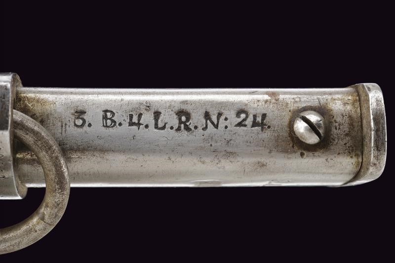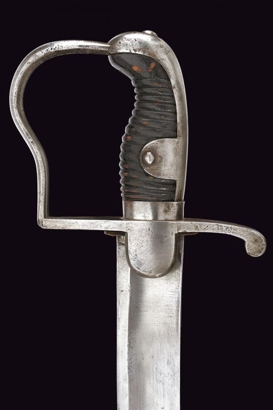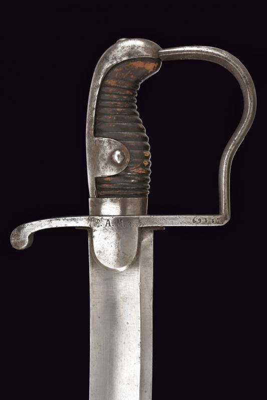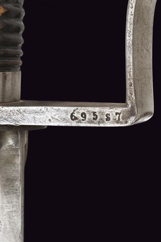 Ampia e robusta lama curva, sgusciata per buona parte della lunghezza, marcata al dorso "24. 695". Fornimento in ferro con guardia a staffa e alette fermafodero. L' elso marcato "8.L.U.4.25." (con accanto un punzone probabilmente tedesco) e "695 S 7", al centro "R.A.M.3.57." (Reserve Artillerie Munitionskolonne?). Impugnatura con cappetta lunga e rivestimento in cuoio. Fodero in ferro a due campanelle, anche questo marcato "R.A.M.3.57." ed anche "8.L.U.4.25." (cancellato) e al dorso "3.B.4.L.R.N:24". La vela con resti di un punzone coronato e tracce di altra marcatura.