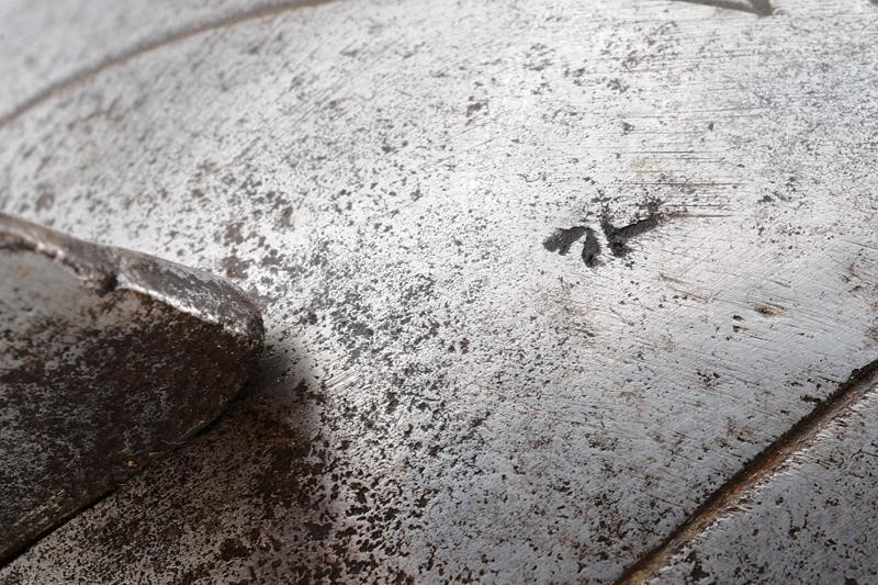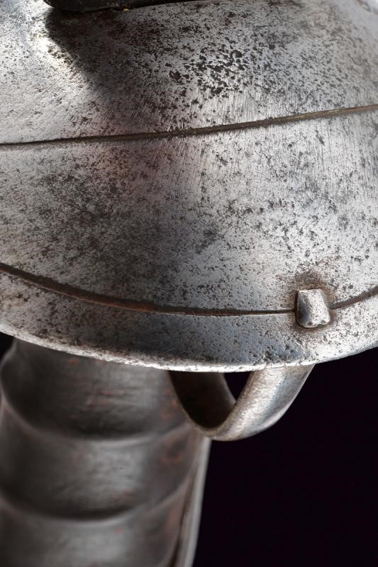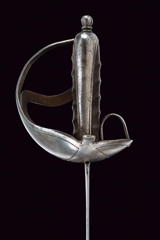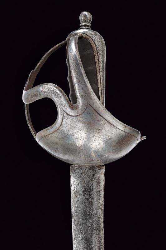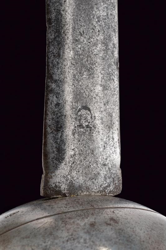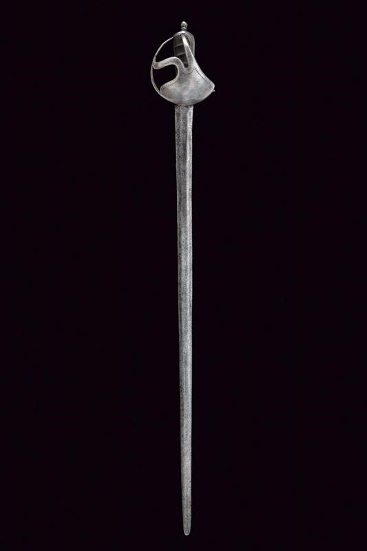 Lunga lama a due fili di sezione lenticolare, recante alla base resti di marcature, con breve tallone. Fornimento in ferro, coccia con punzoni "T" e "P", tre rami di guardia, anello da pollice. Impugnatura anatomica in legno rivestita di cuoio. Cappa lunga, la sommità con bottone.