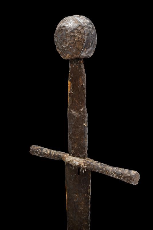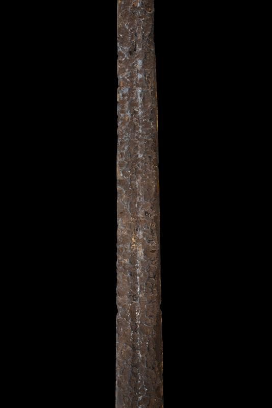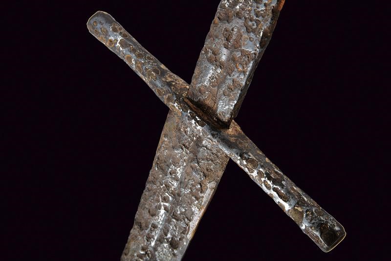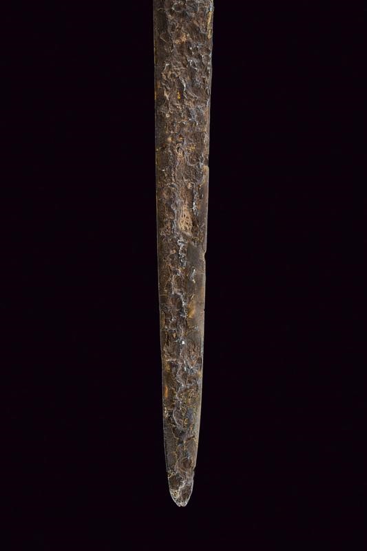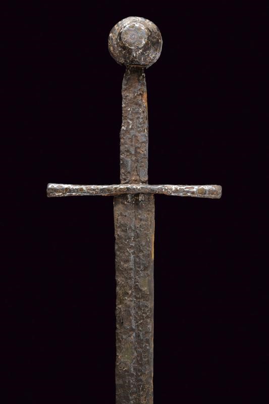Lama dritta a due fili con sguscio centrale. Elso a bracci dritti di sezione esagonale. Grande pomo a disco ingrossato al centro.