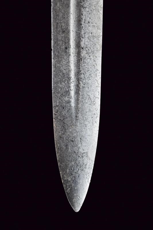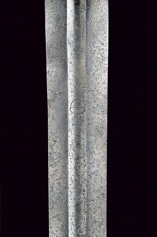 Larga lama dritta a due fili con sguscio centrale, recante alla base il globo imperiale. Bracci dell'elso quasi dritti, pomo a disco rilevato al centro. Impugnatura in legno, rivestita di cuoio.