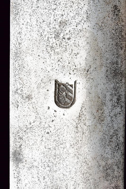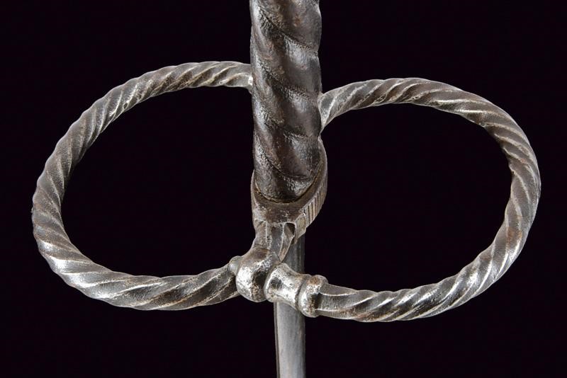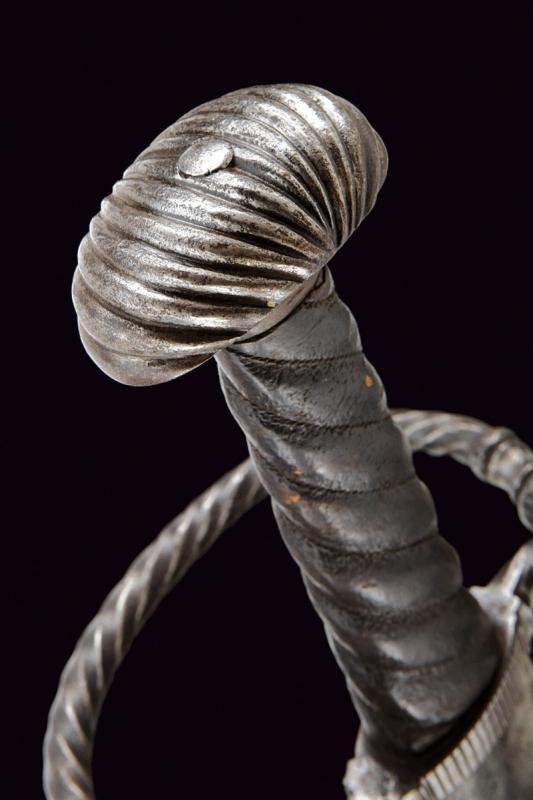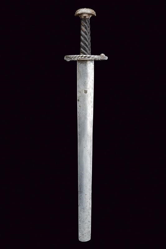 Larga lama dritta a due fili con punta piatta, recante su un lato bella marca profonda (molto simile a quella di Norimberga). Fornimento in ferro con tipico elso a "S" intagliato a spire e con estremità ingrossate ed intagliate. Bel pomo largo a fungo con scanalature a raggi. Impugnatura in legno scolpita a spire e rivestita di cuoio.