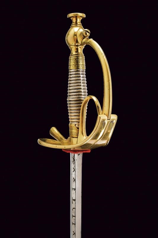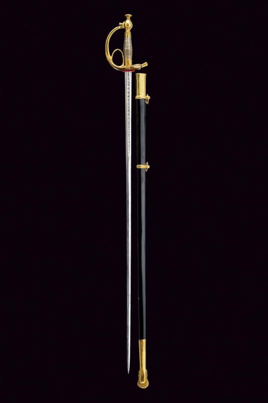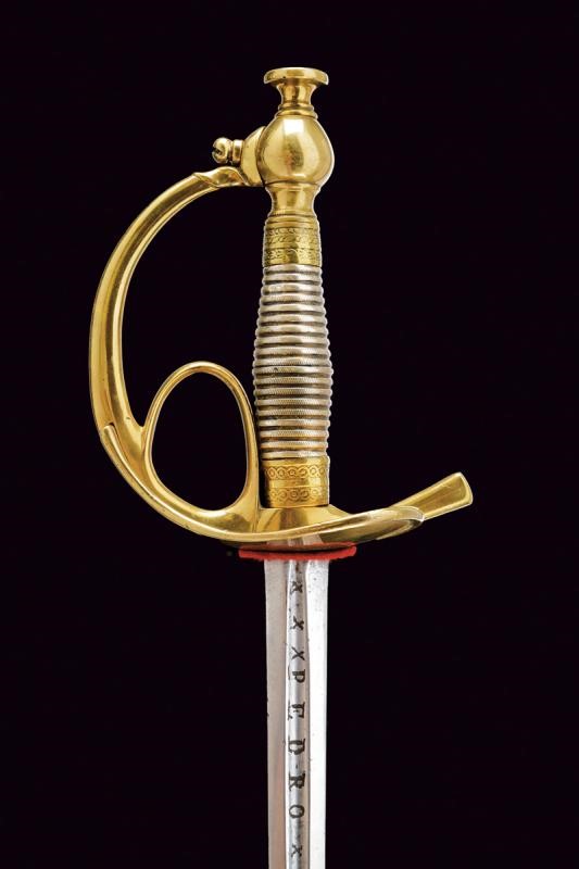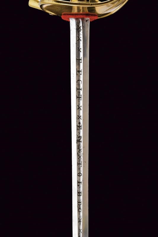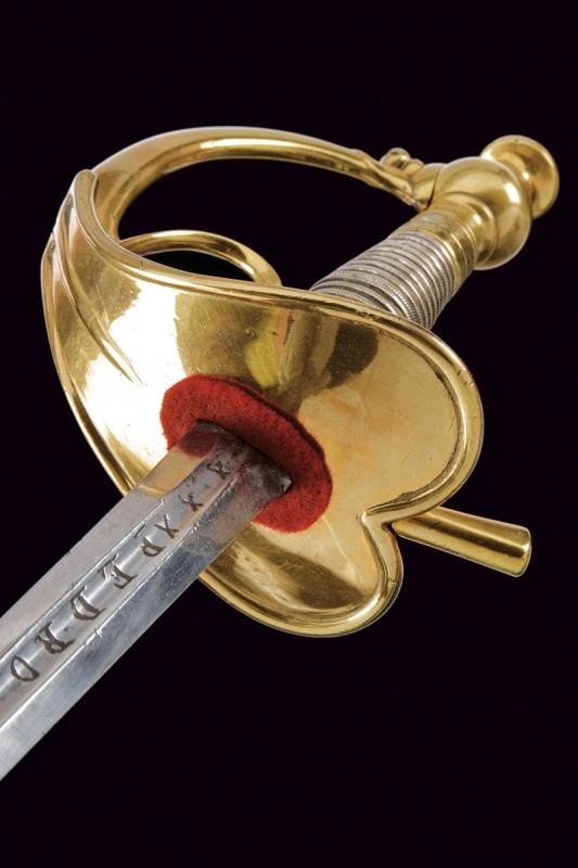 Lama dritta due fili di fattura spagnola del XVIII secolo; alla base sul lato di terza entro lo sguscio, l'incisione "PEDRO DEL MONTE" fra "X", sul lato di quarta invece, sempre dentro allo sguscio, l'inscrizione "FECIT EN TOLEDO", anch'essa fra "X". Fornimento in ottone con coccia a cuore, guardia, anello di presa. Impugnatura in lamina metallica (piccoli difetti ); pomo con grande bottone. Fodero in ferro rilaccato di nero con fornimenti in ottone, due campanelle.
