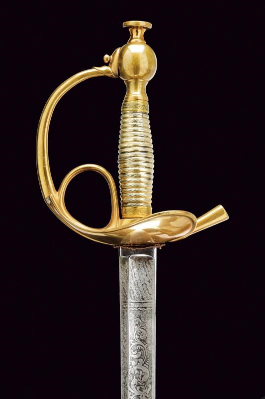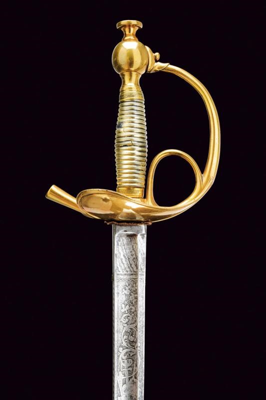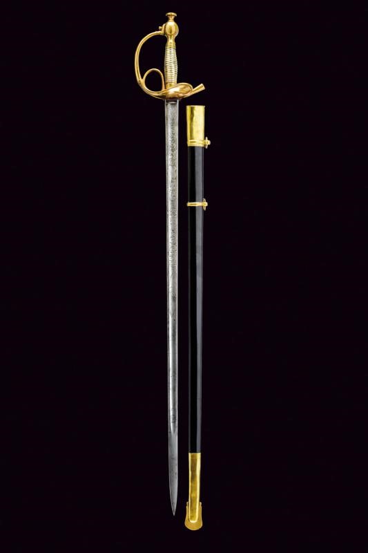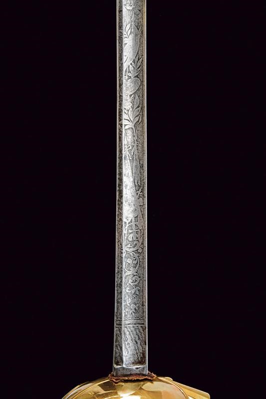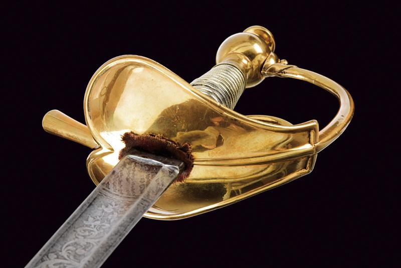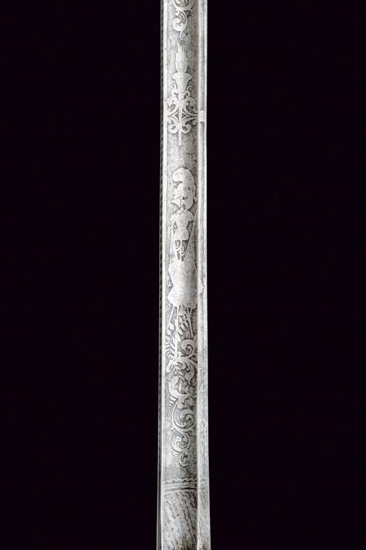 Lama dritta a un filo e controfilo con ampio sguscio, al prima parte incisa all'acquaforte a trofei e motivi floreali. Fornimento in ottone con coccia a cuore, guardia, anello di presa. Impugnatura in lamina metallica (piccoli difetti); pomo con grande bottone. Fodero in ferro rilaccato con fornimenti in ottone, due campanelle.