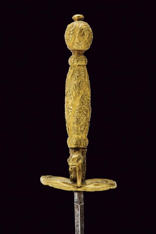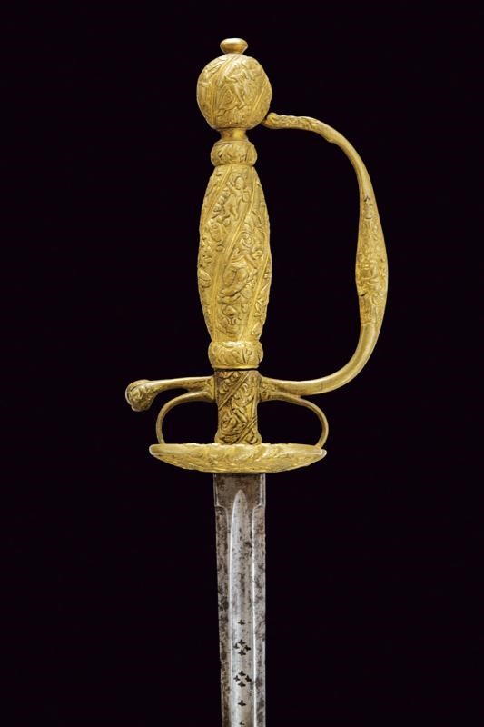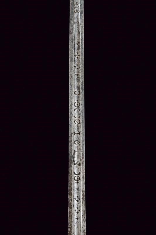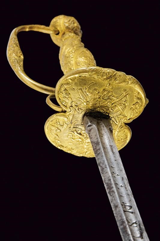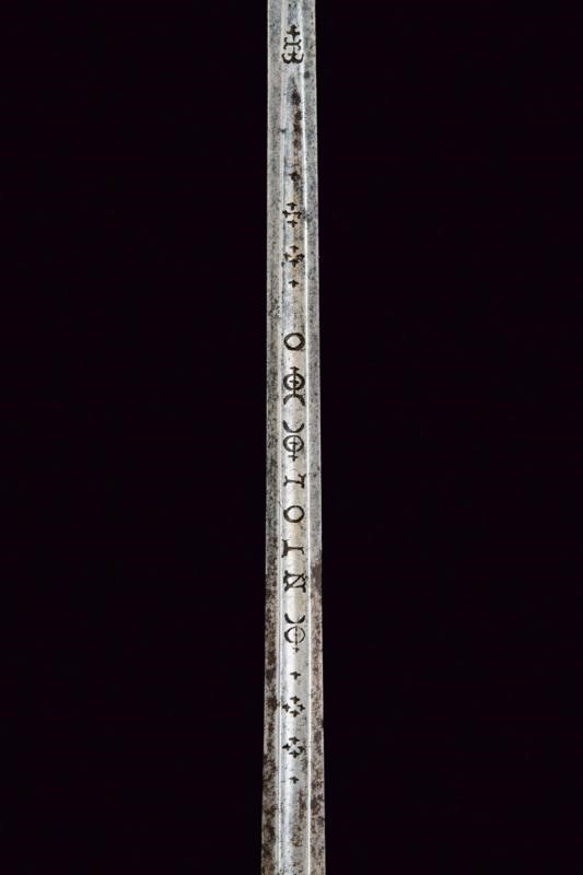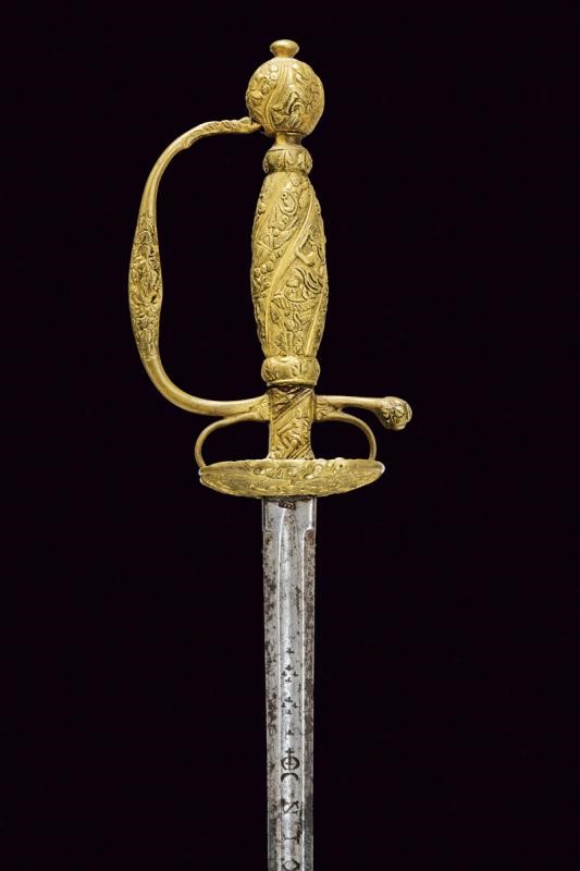 Lama dritta di sezione esagonale, scanalata al forte, con iscrizione "EN TOLEDO" fra decorazioni, il tallone con marca. Fornimento in ottone massiccio ornato con personaggi, putti, bande decorative e a motivi floreali.