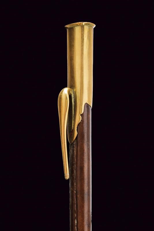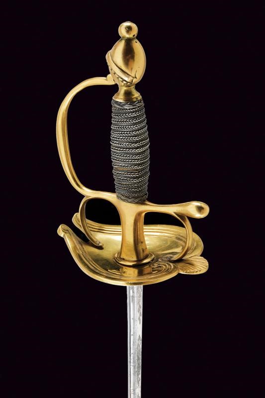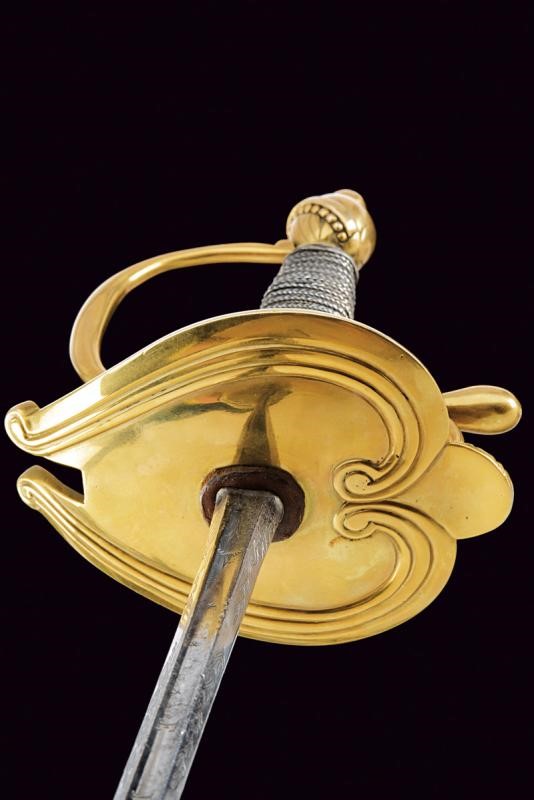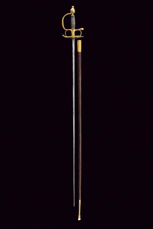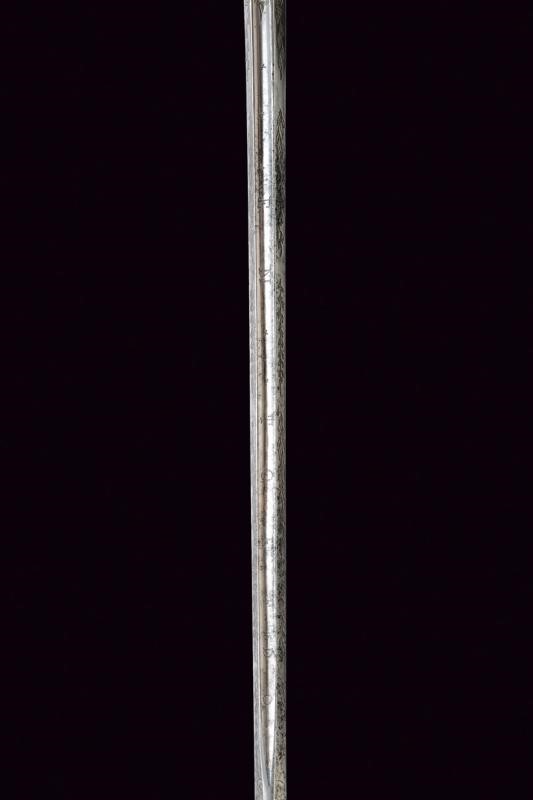 Lunga e sottile lama dritta a due fili (probabilmente del XVIII secolo); la base sgusciata su entrambi i lati, recante l'iscrizione "EN TOLEDO" fra sobrie incisioni a motivi floreali, su un lato anche le cifre "CB"; dopo le incisioni la sezione diventa esagonale. Fornimento in ottone. Coccia a forma di cuore con l'estremità superiore unita da una conchiglia, le superfici della coccia con leggere sgusciature che seguono la curvatura. Due archetti, elso dritto e guardia; tutti questi elementi lisci. Impugnatura con trecciola e teste di moro (una sostituita) in argento (piccoli difetti). Pomo ellittico con bottone sferico. Fodero in cuoio con fornimenti in ottone.