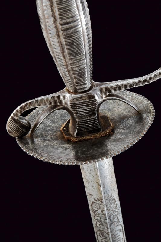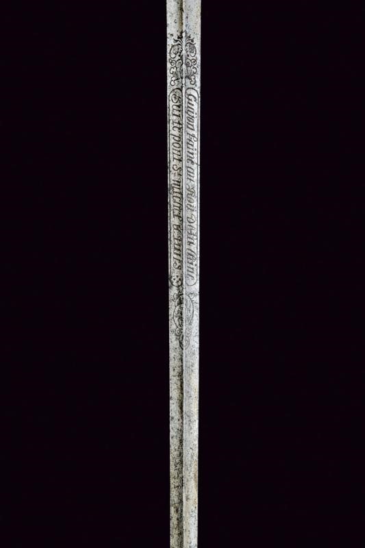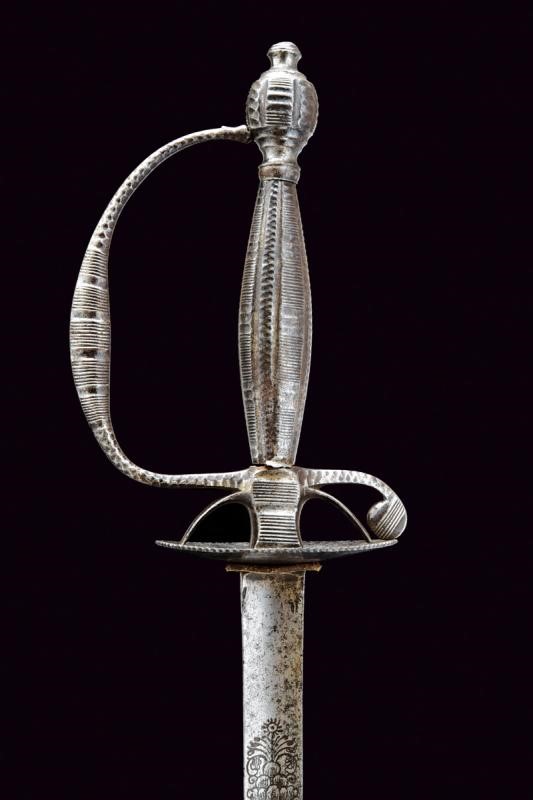 Lama dritta di sezione triangolare, alla base su entrambi le facce la dedica "Guyon faine au Roi de la Chine / Sur le pont S.t Michel a Paris" fra incisioni a motivi floreali. Fornimento in ferro, coccia ellittica con bordo dentato ed inciso, due archetti, guardia, elso ed impugnatura (sempre in ferro) decorati con segmenti sgusciati. Pomo sferico lavorato en suite.