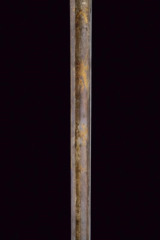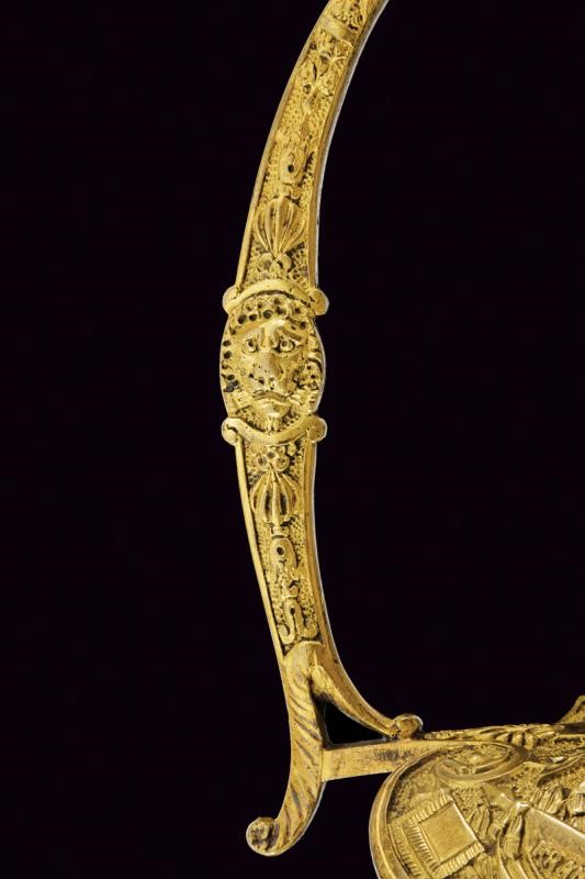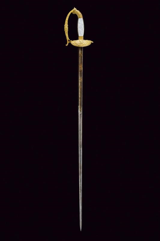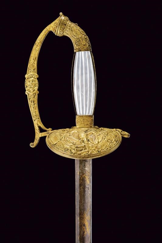 Lama dritta a un filo e controfilo, per metà della lunghezza sgusciata, brunita e con incisioni a trofei e motivi floreali rimesse in ottone; tallone. Fornimento in ottone, pelta decorata in bassorilievo con aquila sormontata dalla scritta "LIBERTE ORDRE PUBLIC", ai lati fascio, trofei e la scritta "FRANCE"; il tutto su fondo granulato. Guardia con leone. Guancette in madreperla, gli elementi laterali finemente lavorati a motivi geometrici. Pomo che si fonde elegantemente alla guardia, lavorato a drone. Privo di fodero.