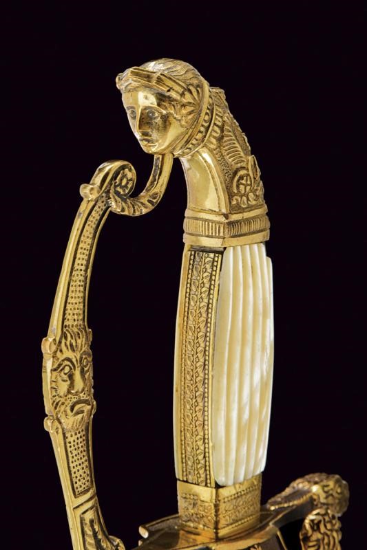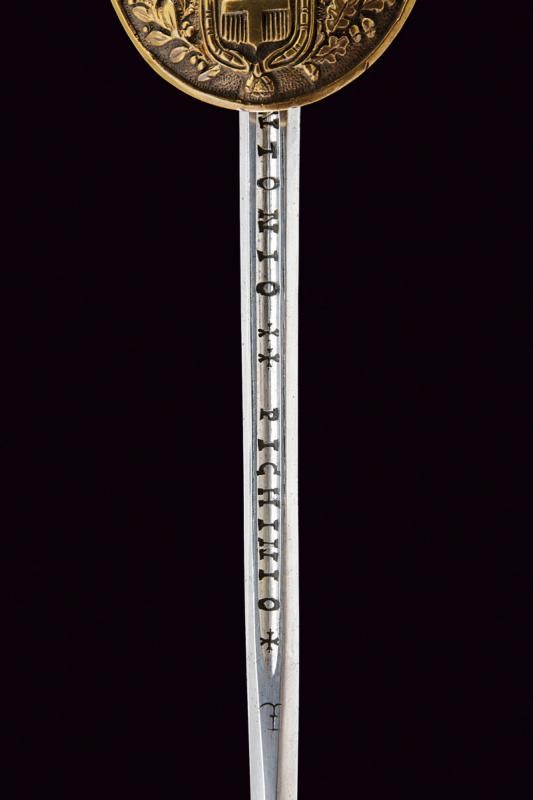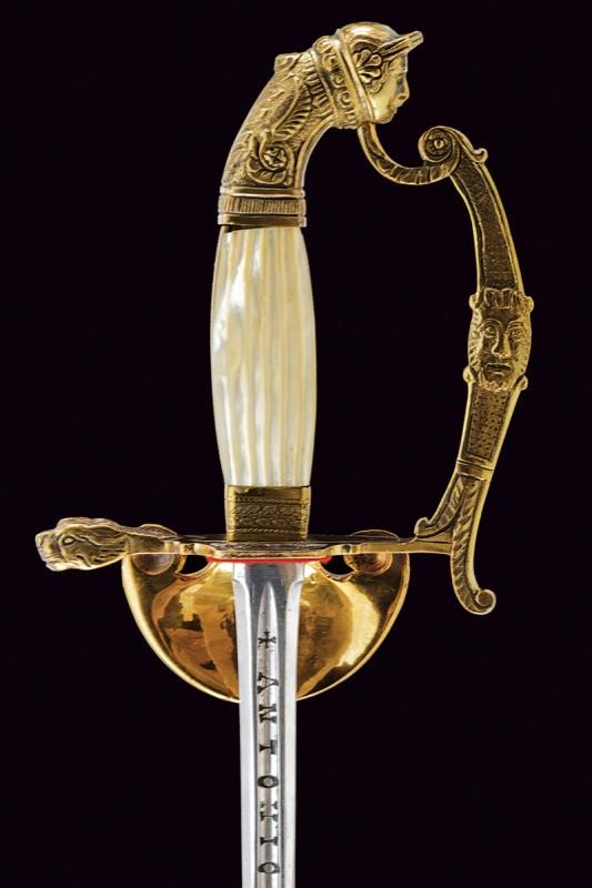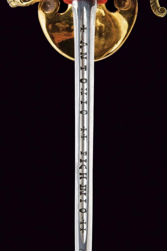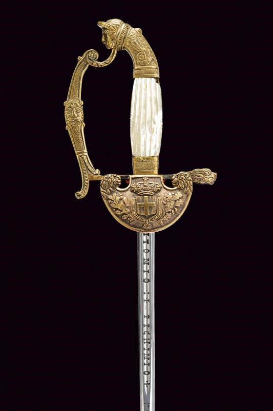 Lama a un filo e controfilo (probabilmente del XVIII secolo) a sezione di losanga, sgusciata al forte e recante la marcatura "ANTONIO PICHINIO" fra croci. Fornimento in ottone. Pelta decorata in bassorilievo con scudo sabaudo sormontato da corona e posto tra fronde di lauro e quercia. Elso e guardia con teste di leone. Pomo a volto antropomorfo. Impugnatura con guancette in madreperla. Fodero in ferro (riverniciato) a due campanelle con fornimenti in ottone. Restauri.