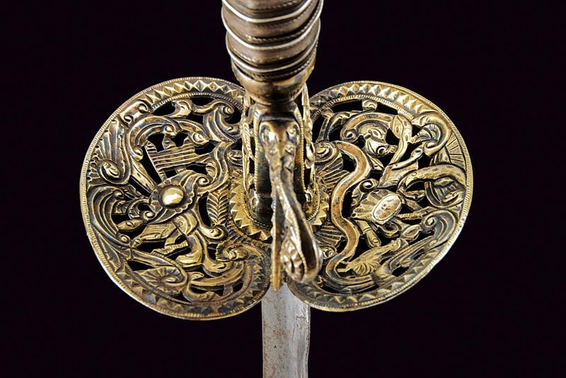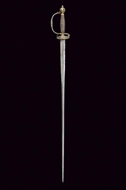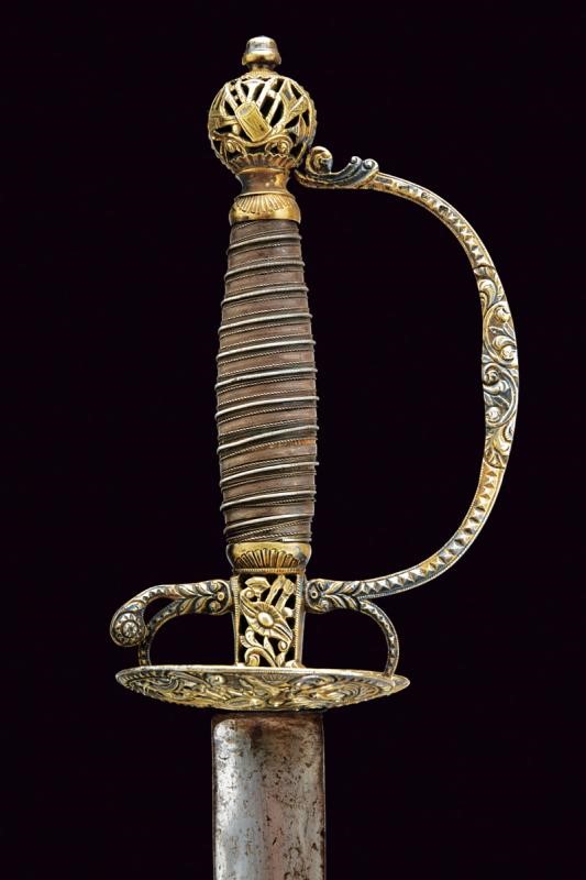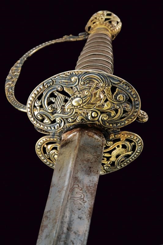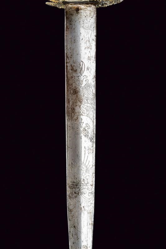 Lama dritta a frantopino di sezione triangolare con facce incavate. La base con sole, trofeo e decorazioni floreali. Fornimento in argento con resti di doratura, finemente traforato ed inciso a trofei e a motivi floreali. Impugnatura in legno rivestita con bande e filo d'argento.