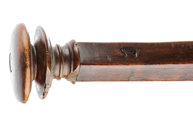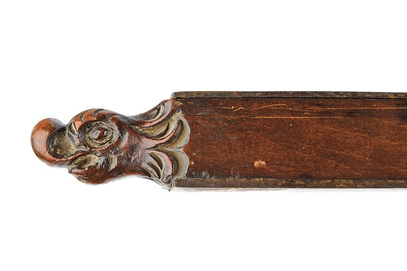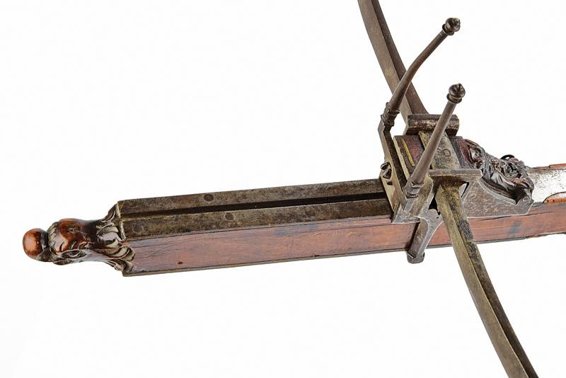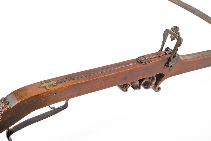 Lungo teniere in legno (piccole mancanze) con intagli maestosi, l'estremità anteriore con testa di volatile a tuttotondo, l'elemento al quale poggia l'arco ornato con un lungo mascherone in rilievo, al centro riccioli traforati e all'incurvatura un altro mascherone; il pomo tornito. Fornimenti in ferro. Il blocco su cui è posizionato l'arco (punzonato al centro) si trova su un carrello mobile e regolabile (la vite per il blocco mancante) ai fini di variare la gittata. Noce in ferro con fornimenti punzonati e munita di alzo mobile. Il dorso con doga di rilascio in ferro che termina con un giglio in ottone. Lungo ponticello e grilletto incurvato.
