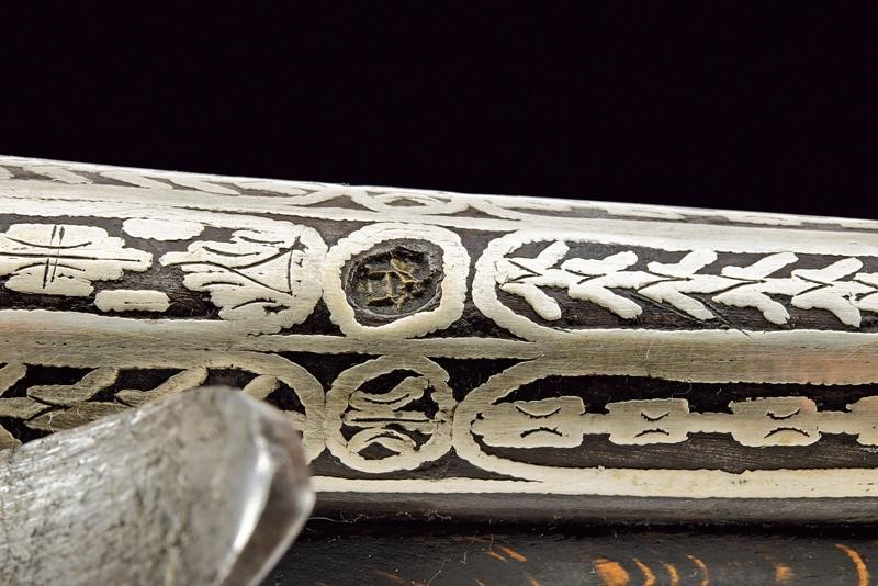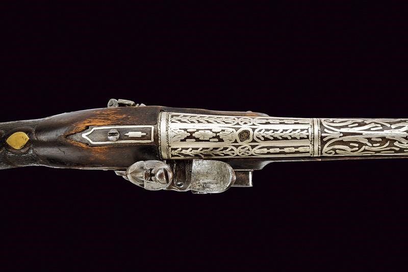 Canna liscia a due ordini, totalmente ornata da agemine in argento a motivi geometrici e floreali, con punzone alla base e volata dotata di strombatura circolare. Codetta con cornicetta in argento. Batteria a pietra focaia con incisioni a stelle, onde e mezzaluna. Cassa intera in legno (piccoli difetti e mancanze) con fornimenti in ottone; sulla contropiastra gancio di sospensione. Bacchetta mancante.