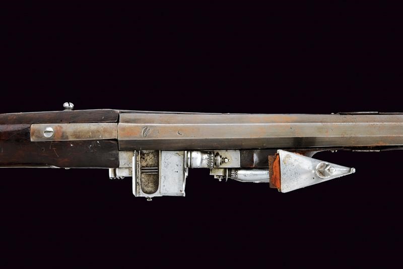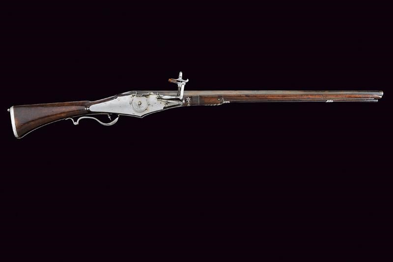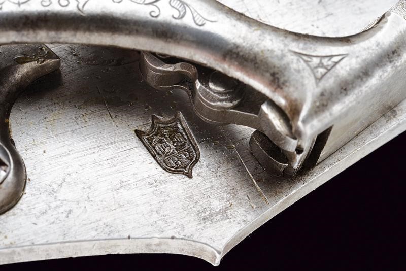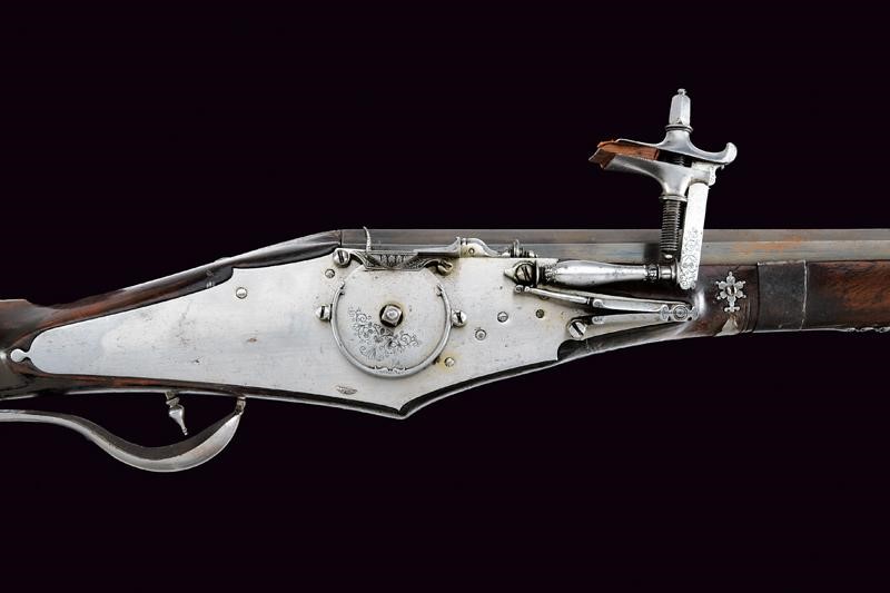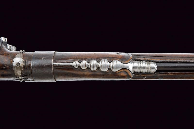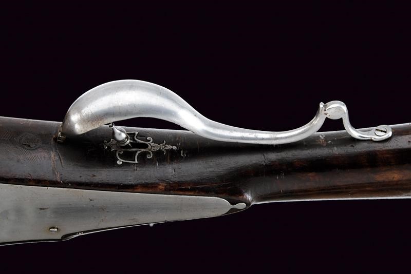 Canna liscia a due ordini; la prima parte ottagonale, con resti di un punzone, la seconda parte tonda, in calibro 15 mm. Codetta liscia leggermente angolata. Grandissima batteria arcaica a ruota esterna incisa a motivi floreali e con cornice, cartella piatta; scodellino, copriscodellino scorrevole, molla e cane con intagli ed incisioni floreali; all'interno bella marca "BP" sotto aquila bicipite e incisioni a motivi floreali. Cassa intera in legno con fornimenti in ferro parzialmente traforati ed incisi. Bacchetta in legno (probabilmente accorciata).