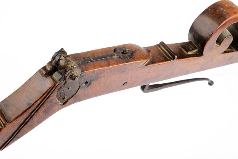 Teniere in legno di forma arcuata nella sezione anteriore, con fornimenti in ferro. Arco controcurvato di sezione rettangolare. Visiera intagliata a spire. Al dorso decorazione traforata. Piccolo pomo a disco.