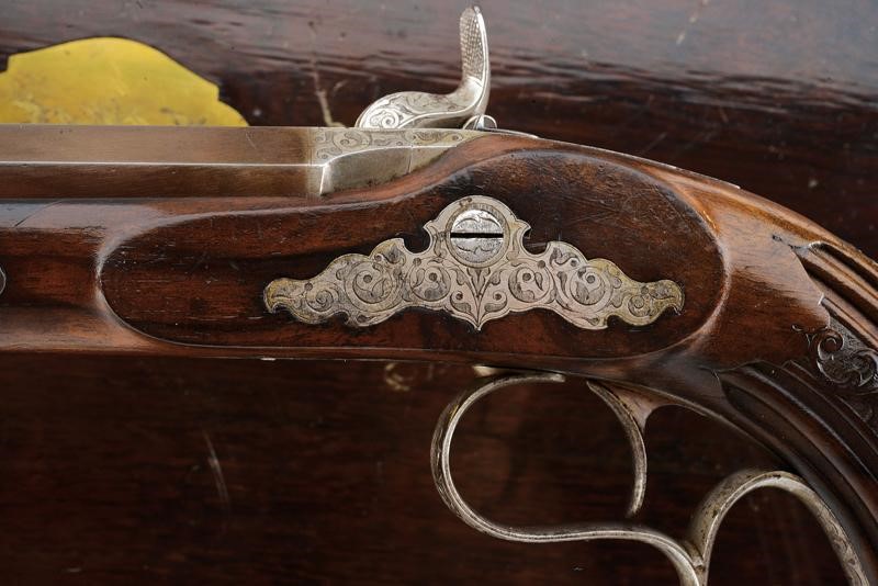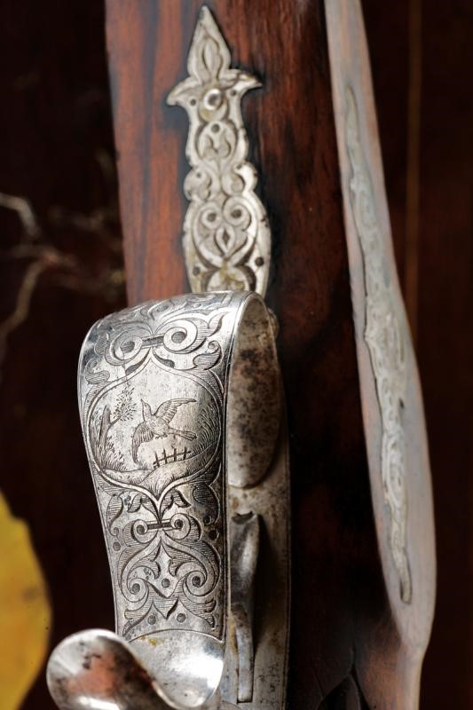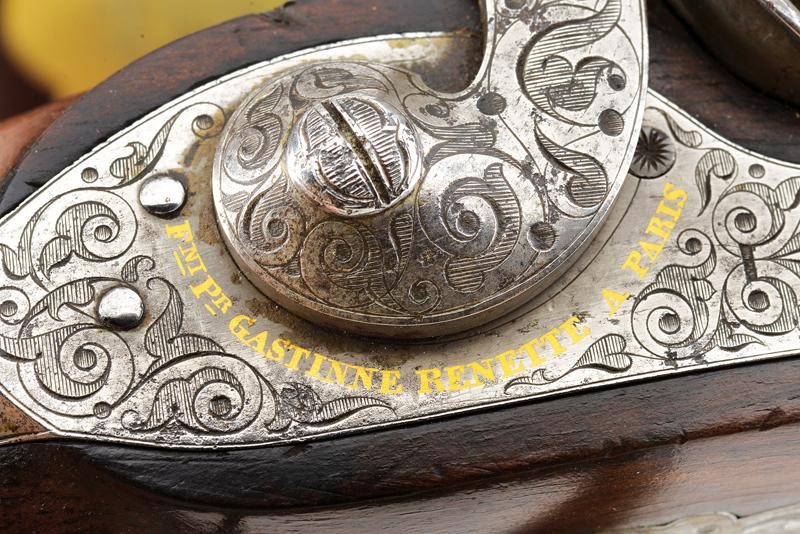 Canne rigate (anima pulita, qualche piccolissima intaccatura, le rigature ben visibili), ottagonali, brunite, firmate in oro (lievi mancanze) "F.NI PAR GASTINNE RENETTE A PARIS", finemente incise a volute alla base, dotate di mirino di precisione, cal. 12.3 mm. Codette incise en suite e munite di alzo. Belle batterie a luminello a molla in avanti, cartelle piatte totalmente incise, recanti un uccello, un segugio, volute e decorazioni floreali; anche il cane completamente inciso. Le cartelle firmate in oro "F.NI P.R GASTINNE RENETTE A PARIS, con code ribassate. Casse a tre quarti in legno scolpito; i calci scanalati e con racemi che si ripetono anche al muso. Fornimenti in acciaio incisi en suite alla batterie, ponticelli con poggiadito. I grilletti pur non avendo lo stecher si presentano con una sensibilità elevatissima. Nella loro cassetta originale in legno (piccoli difetti), con coperchio recante il monogramma "PRI"; l'interno rivestito in velluto marrone. Dotazione completa di tutti gli attrezzi fra i quali, una piccola fiasca da polvere, il fondipalle, un cacciavite, un martello in legno, bacchette e la chiave per la serratura. Di buona fattura.