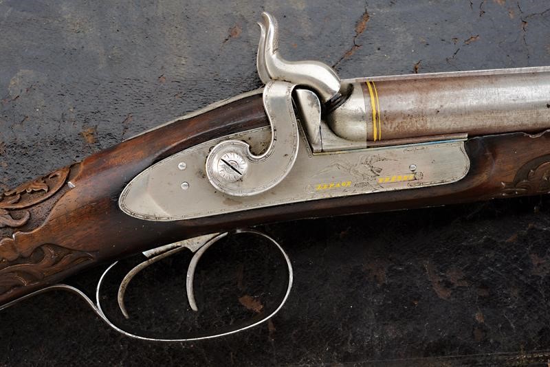 Canne lisce (anima pulita), tonde, in damasco, brunite, con bindella marcata in oro "Damas Tres Fin", base recante cornici in oro, mirino, calibro 18 mm in volata. Codetta incisa, munita di traguardo e parascintille. Batterie a molla in avanti, cartelle firmate "LEPAGE FRERES" e "A PARIS" in oro, le marcature sormontate da un'aquila con saette, i bordi incisi con ghirlanda. Mezza cassa in legno (piccolo difetto al calcio) finemente scolpita a motivi floreali e con fornimenti in ferro brunito, con bordi incisi en suite. Bacchetta in legno con cavastracci in ferro e battipalla in ottone. In cassetta di legno rivestita di cuoio (mancanze) e foderata all'interno con velluto color blu, munita di vari attrezzi e di due fiasche (una per i pallini e una per la polvere). Chiave mancante.
