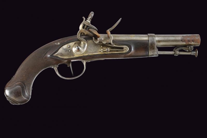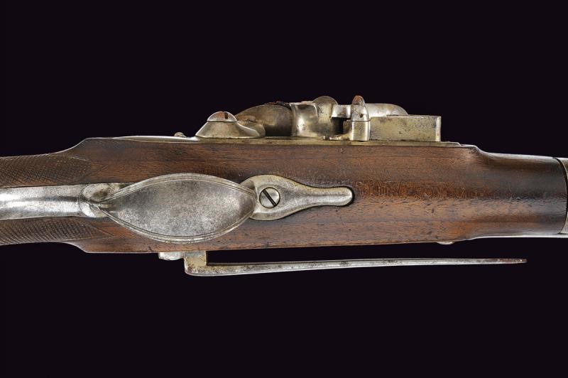 Canna liscia a due ordini, la prima parte ottagonale con punzone ovale "YBARZABAL" (vedi Stöckel 8577), la base con cornice in oro, segue un segmento tondo con incisioni a volute dorate al cambio, cal. 18 mm. Lunghissima codetta liscia. Batteria a pietra focaia firmata "En Eybar". Cassa a tre quarti in legno con calcio zigrinato. Fornimenti, gancio da cintura e bacchetta a snodo in ferro. Alcune zone con ruggine superficiale.