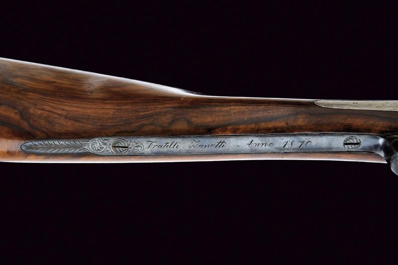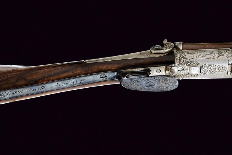 Canne tonde lisce, in damasco, dotate di bindella, cal. 16. Anime pulite, con qualche intaccatura all'interno. Batterie a molla indietro con fini incisioni effigianti fiorami e fagiani. Meccanica funzionante. La bascula con incisioni en suite, presenti anche al codolo (la cui vite non tiene). Calcio ed astina in bella radica marezzata. Il ponticello funge anche da sblocco della chiave, ornato con monogramma "EM"; il suo codolo firmato e datato "Fratelli Zanotti 1870". Tracce di brunitura. Calciolo e altri fornimenti in ferro.