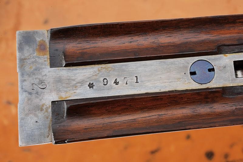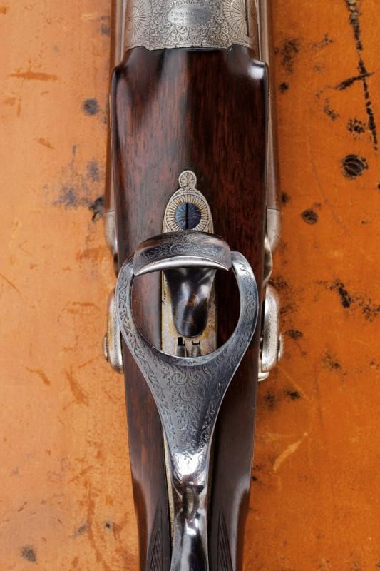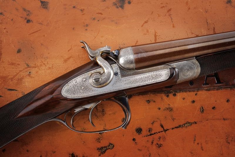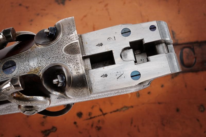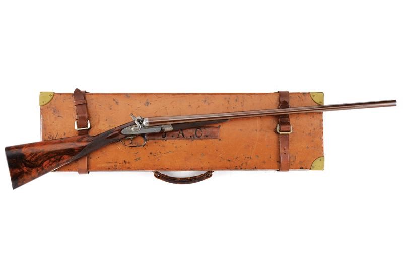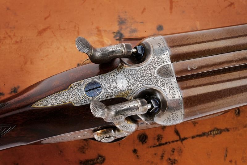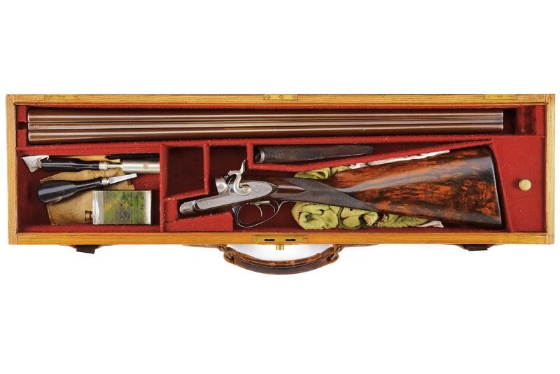 Canne tonde lisce, cal. 16, in fine damasco, dotate di bindella recante la firma "J. PURDEY 314 1/2 OXFORD STREET LONDON", con mirino in argento. La bindella con il numero "2" in culatta. L'anima ben conservata, a specchio, con minimi segni all'interno (forse solo polvere). Nella parte inferiore timbri del banco di prova di Londra, numeri di serie e "15". Bella brunitura color marrone (più tarda?). Bascula finemente incisa a racemi, anche questa marcata "N.2" e punzonata a Londra. Il codolo dorsale marcato "PATENT". Il lato inferiore "PURDEY'S PATENT". Batterie con cani esterni a rimbalzo, anche queste finemente incise a racemi, ben funzionanti e firmate "PURDEY". La chiave con apertura a leva di forma palmata posta davanti al ponticello. Questa, come anche il ponticello stesso e il suo codolo con resti di brunitura color blu. Matricola coeva su canne, codolo del ponticello e croce (anche questa con n.2). Calcio ed astina in legno marezzato, entrambi con segmenti finemente zigrinati. L'astina con lieve mancanza e piccoli restauri. La pala recante scudetto d'argento sul lato inferiore con dicitura "COUNT HESPEL" sormontata da corona comitale e soprastante la data "1875". Il calciolo sempre in lamina di legno. In una cassetta da viaggio non coeva ma dell'epoca, con struttura in legno rivestita in pelle e lavorata a valigetta. Con fodera antica in panno rosso. Dotata di alcuni accessori.