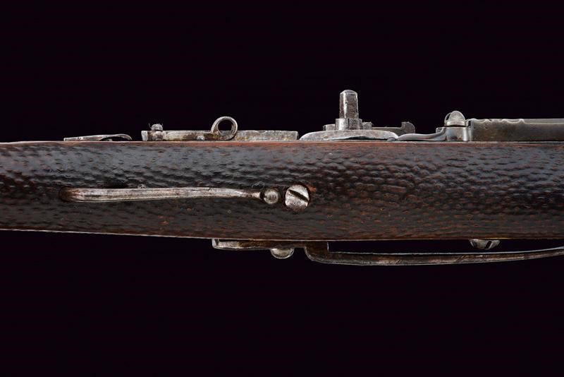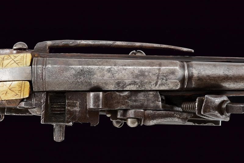 Canna liscia a due ordini, prima ottagonale e con cornice alla base, poi tonda e con anellatura al cambio; la volata con delineature, cal. 10.5 mm. Codetta liscia angolata. Batteria arcaica a ruota esterna, con molle intagliate, munita di sicura e copriscodellino a scatto; zone con danni da ruggine. Cassa intera in legno decorata sul tipo dei puffer da truppa degli elettori di Sassonia, Cristiano I e II. Tarsie in osso incise a motivi floreali e geometrici. Il pomo di forma sferoide schiacciata ai poli. Ponticello e gancio da cintura in ferro. Manca la spina reggicanna anteriore. Bacchetta in legno con battipalla in osso.
