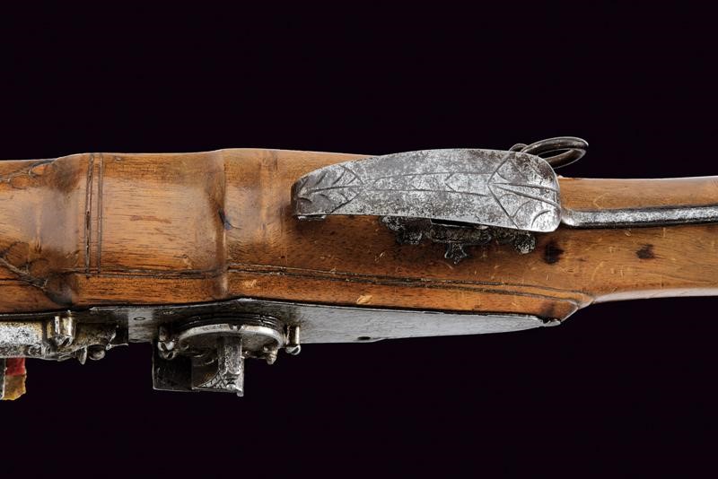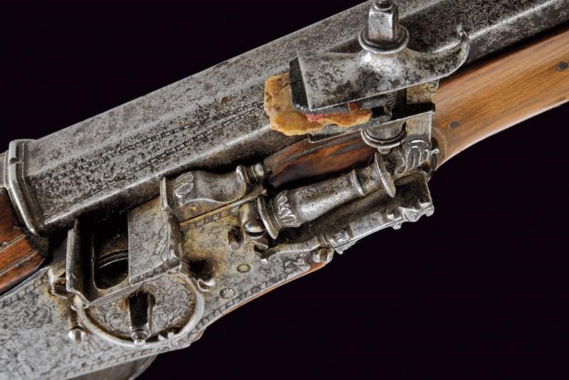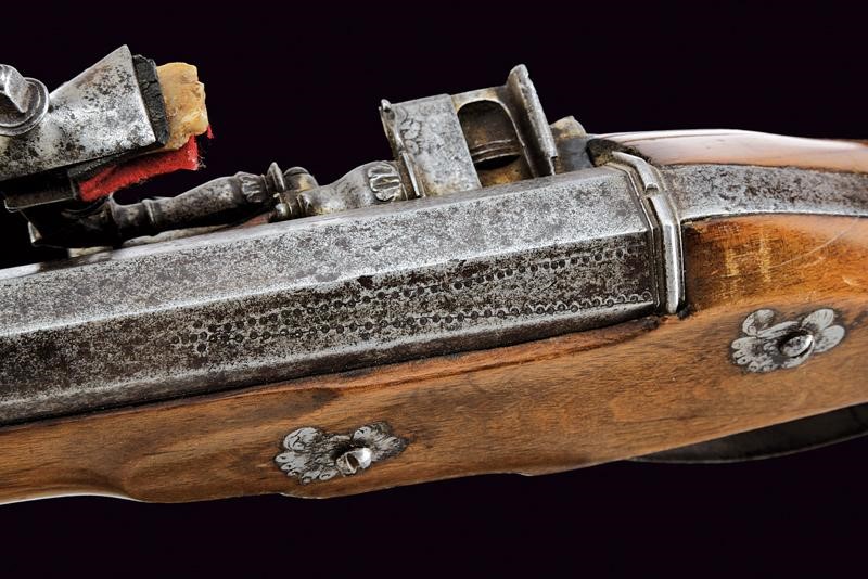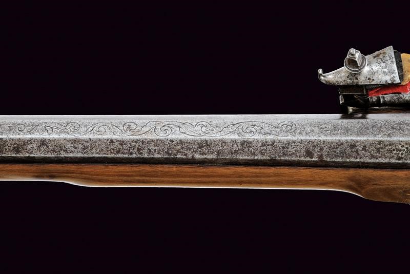 Canna ottagonale liscia, la cornice alla culatta con traguardo, la prima parte decorata con incisioni floreali e geometriche, mirino, cal. 15 mm. Codetta liscia leggermente angolata. Bella batteria a ruota esterna, finemente incisa con effige di cavaliere in sella posto davanti a un città, nel cielo un angelo su una nuvola che porge una corona al cavaliere, inoltre un volatile e decorazioni floreali e geometriche; lo scodellino, la molla e il cane con intagli, il copriscodellino scorrevole. All'interno della cartella bella marca "IS" sopra aquila bicipite e incisioni con volatile e a motivi floreali. Cassa intera in legno con calcio faccettato di profilo stretto e allungato. Fornimenti in ferro inciso. Una delle due viti della batteria con filettatura consumata, non tiene bene la presa. Sul lato sinistro l'anello da sella. Bacchetta in ferro con battipalla in osso.