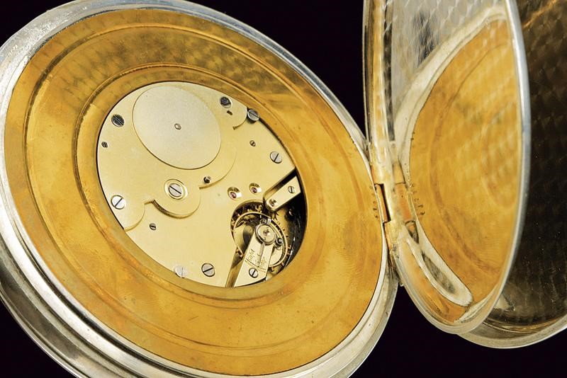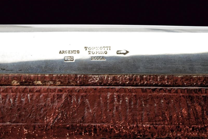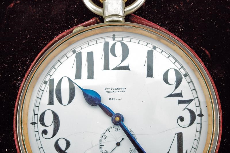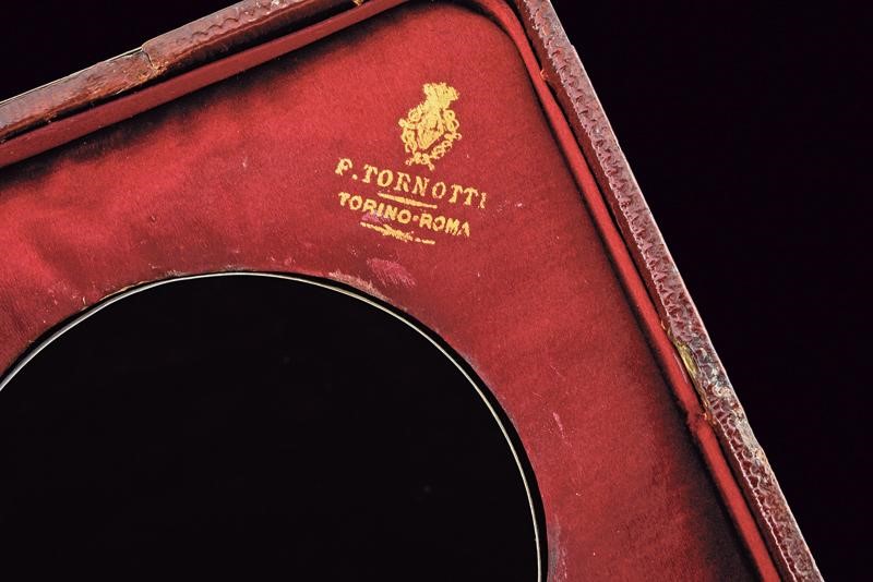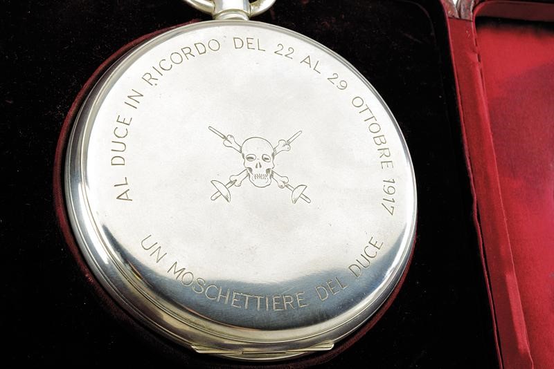 Bellisimo regalo da parte di un moschettiere del duce a Mussolini. Orologio da tasca di grande formato (diametro 12 cm). Il quadrante in smalto bianco firmato "F.co Tornotti / Torino-Roma" e marcato "8 Jours", con numeri arabi in colorazione nera, lancette brunite, a ore sei contatore dei secondi. Sul retro teschio su tibie e fioretti incrociati, con dedica al bordo "AL DUCE IN RICORDO DEL 22 AL 29 OTTOBRE 1917 / UN MOSCHETTIERE DEL DUCE". Nel suo astuccio originale in pelle rossa, foderato in velluto e seta color borgogna e con stampigliatura "F. TORNOTTI TORINO-ROMA" in oro. Il coperchio in lamina d'argento con finestra circolare che mette a giorno il quadrante, e recante agli angoli la "M" incisa di Mussolini in corona d'alloro, l'aquila su fascio, il fascio d'alloro e lo stemma di Roma con iscrizione "SPQR", posti tra i fregi i motti "NIENTE RITIRATA, NESSUN COMPROMESSO / FERMI E RISOLUTI! / AVANTI SEMPRE FINO ALLA RIVINCITA!"; datato "29 Ottobre 1927".